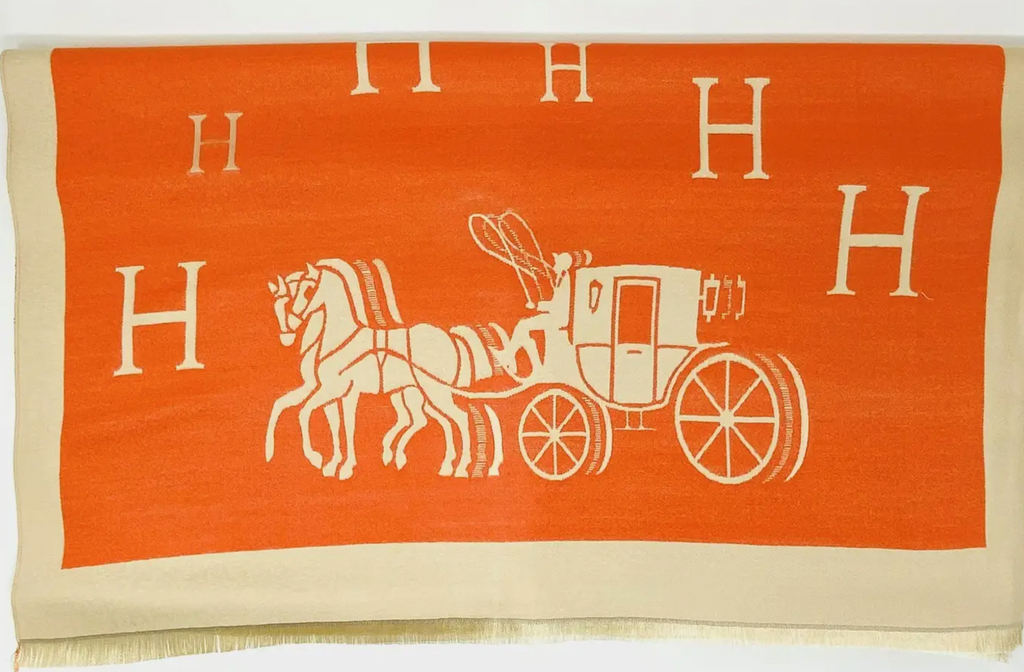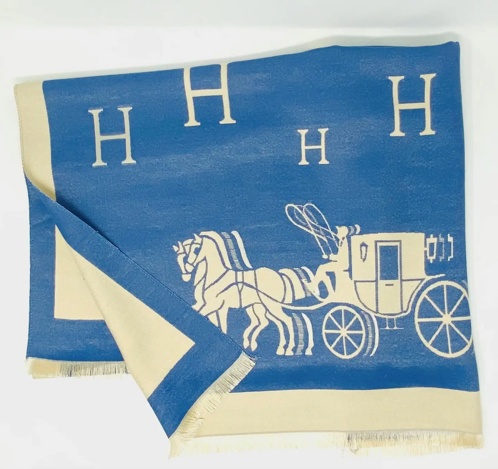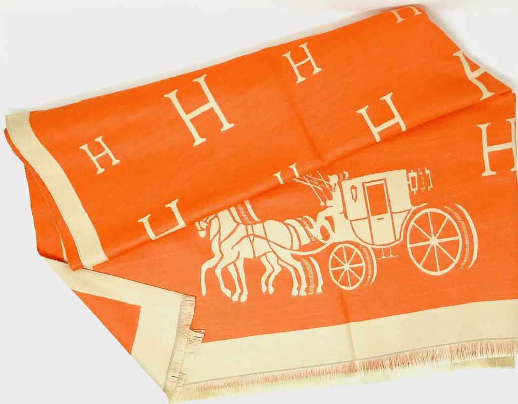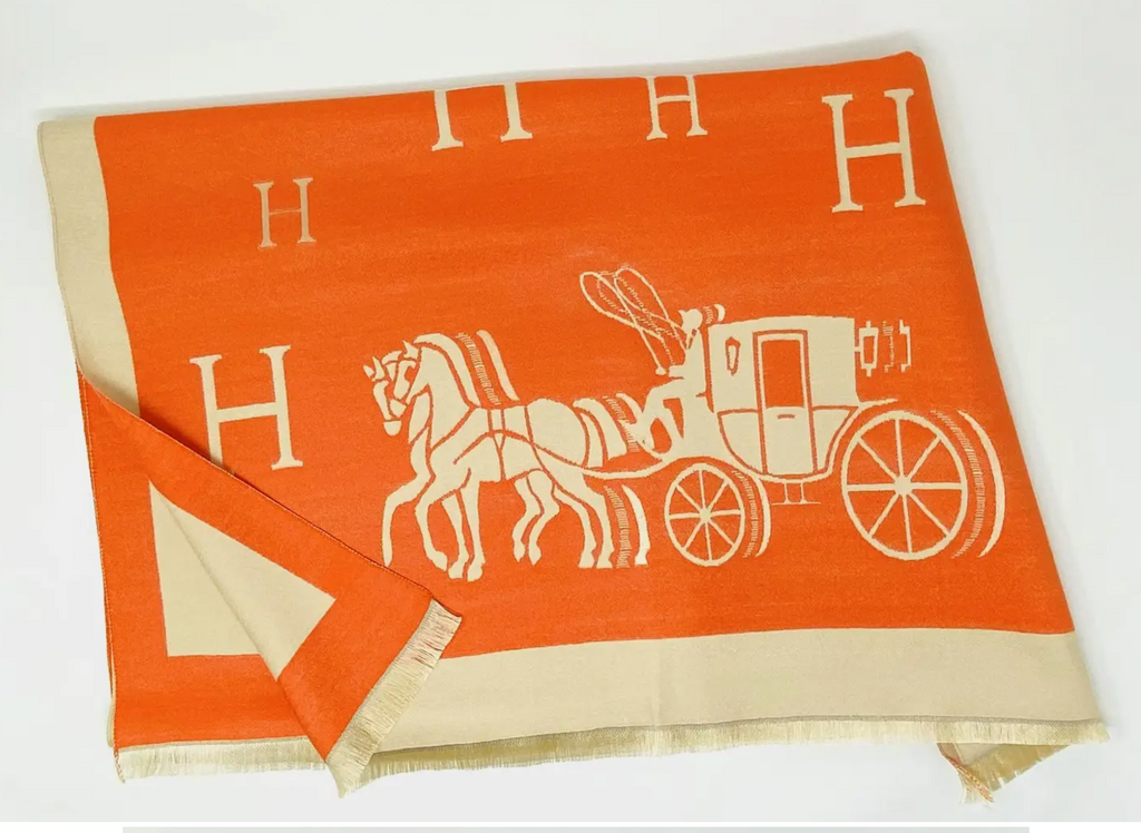 This H scarf with equestrian accent is 74" length x 25.5" wide