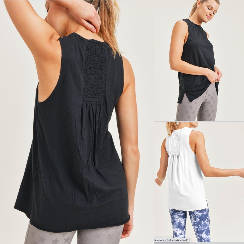 This tank top has a flowy silhouette, a notch on each side, as well as a shirred and gathered accent on the back for a flirty look. Perfect to layer over your activewear or as use as loungewear or throw on with shorts! The quality and fit is so good!!