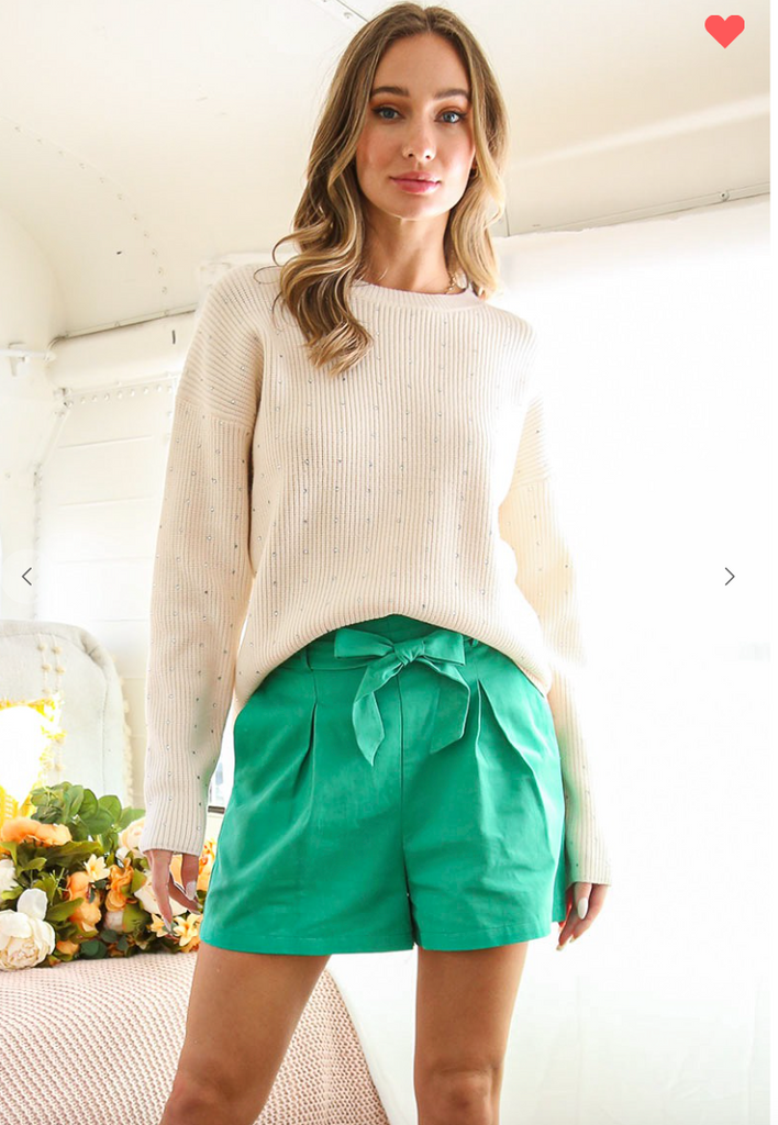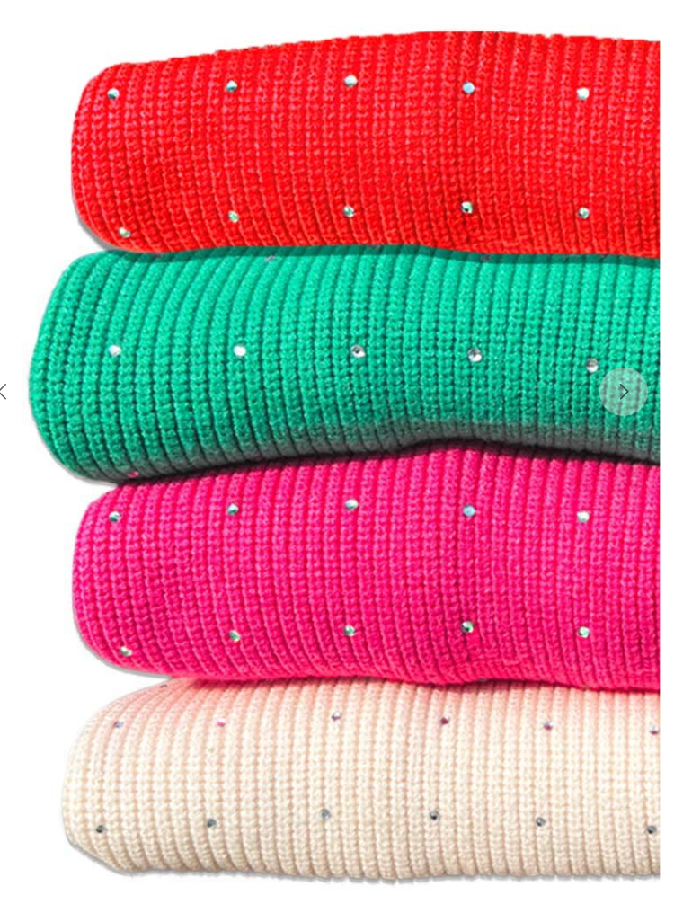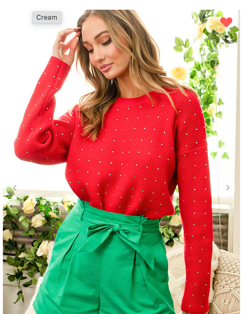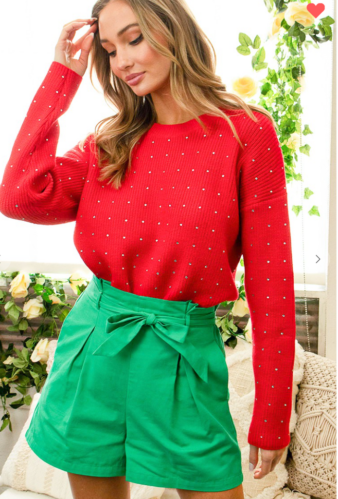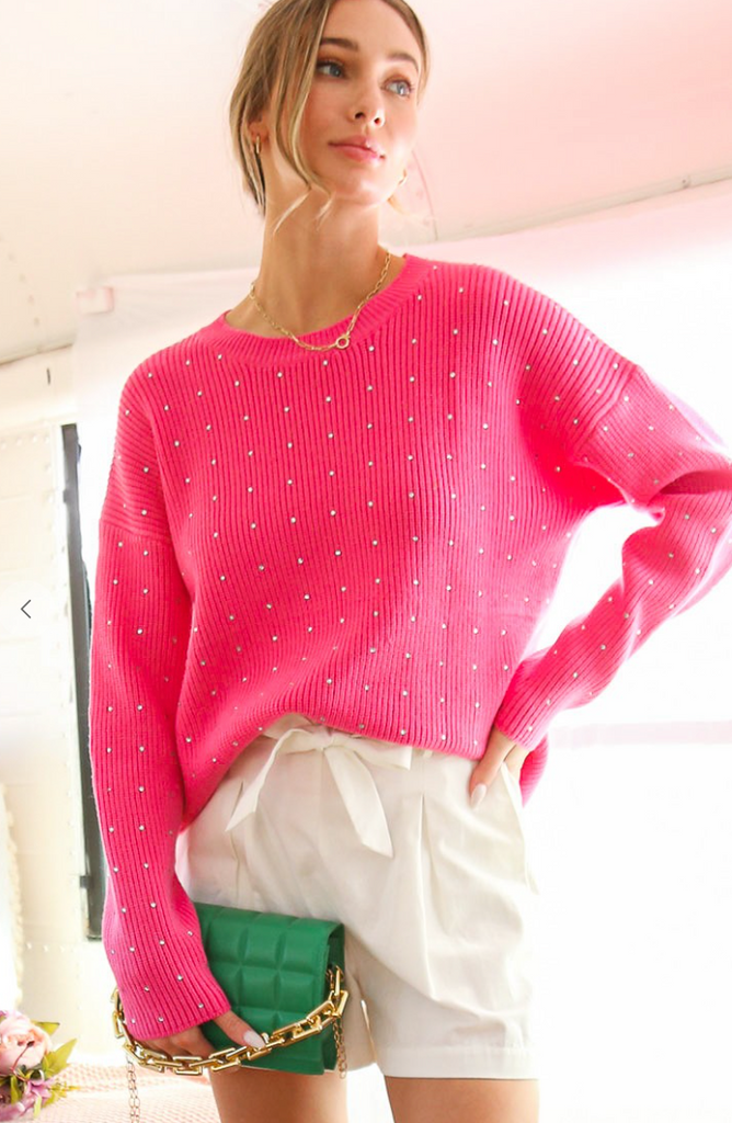 We love the crew neck long sleeve sweater with the rhinestone detail! Pair with jeans or leggings or a cute skirt!
