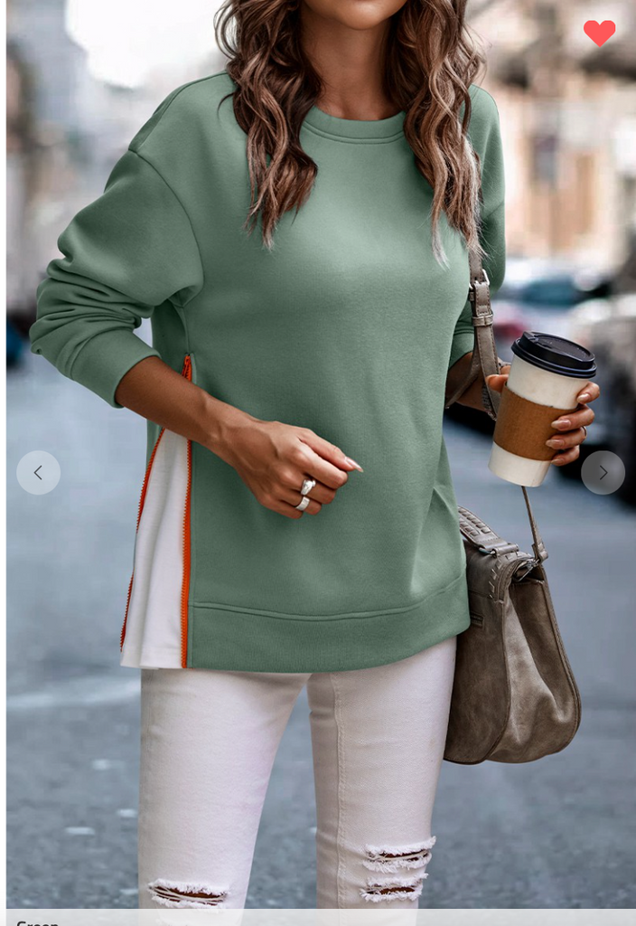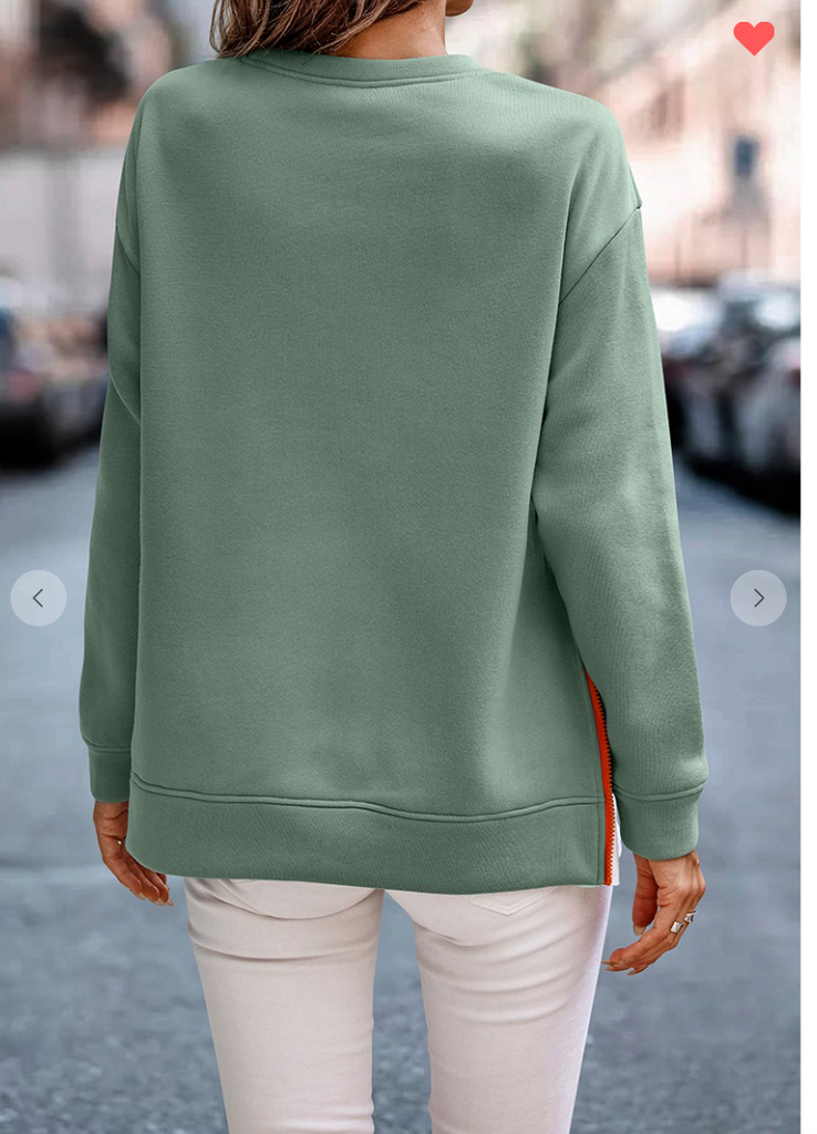 What a darling take on a sweatshirt! Lightweight but cozy,zipper side detail, love the
