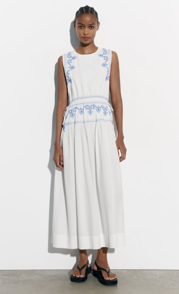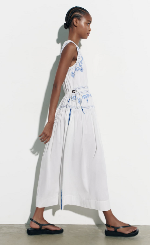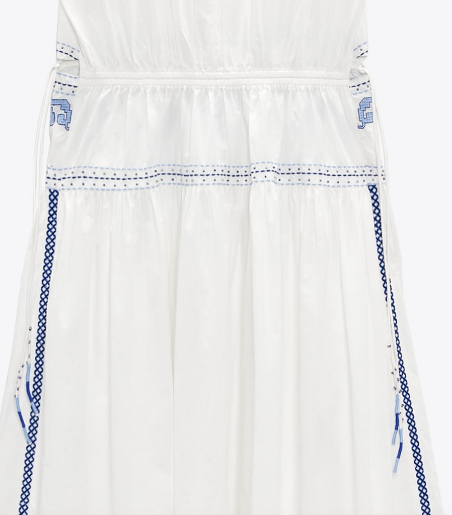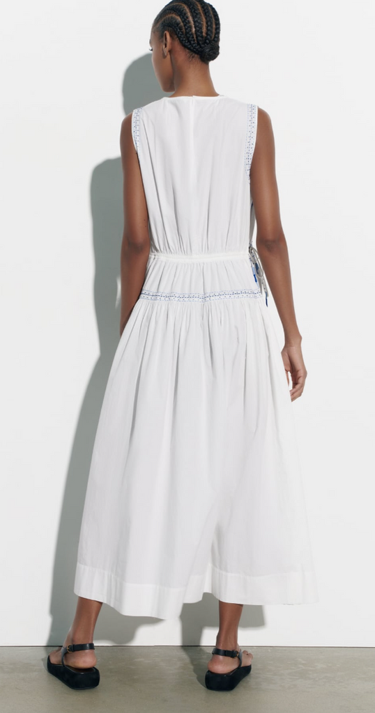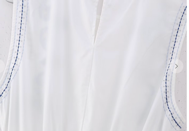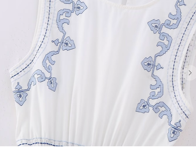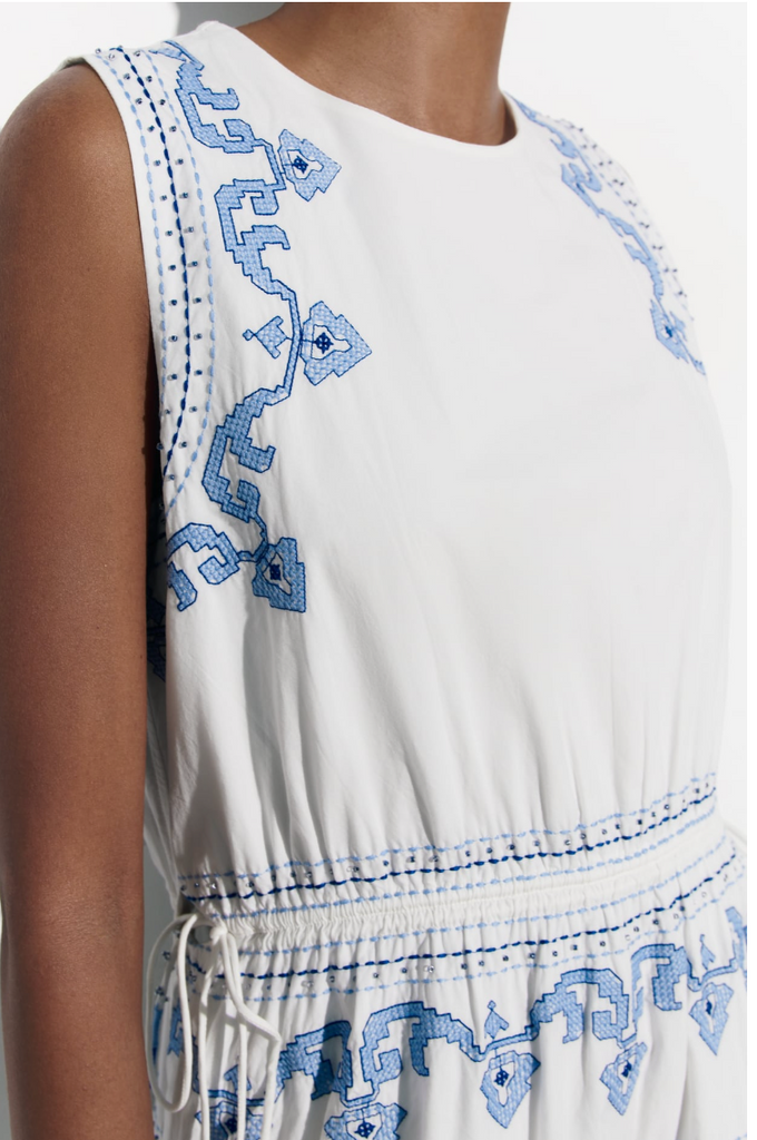 A Cotton Midi Dress with with a sleeveless design and round neck sports a contrast embroidery in a gorgeous blue and navy. Adjustable elastic tie waist and a back opening with button closure.