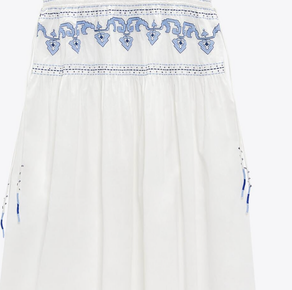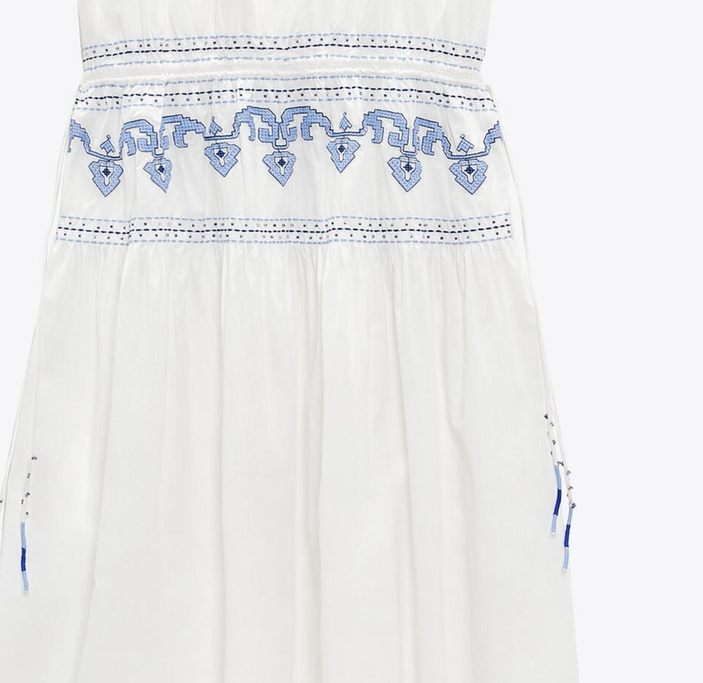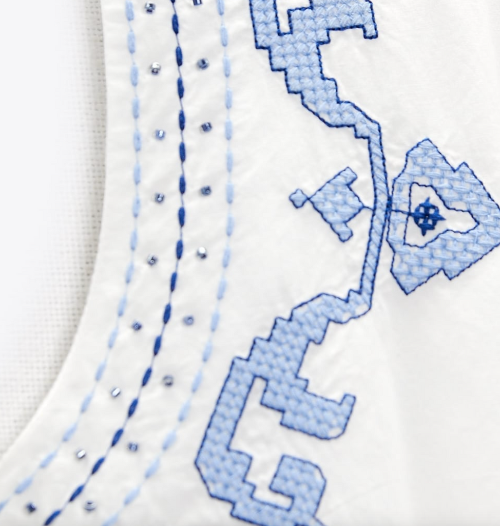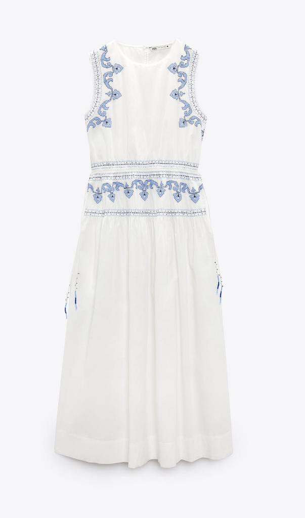 A Cotton Midi Dress with with a sleeveless design and round neck sports a contrast embroidery in a gorgeous blue and navy. Adjustable elastic tie waist and a back opening with button closure.