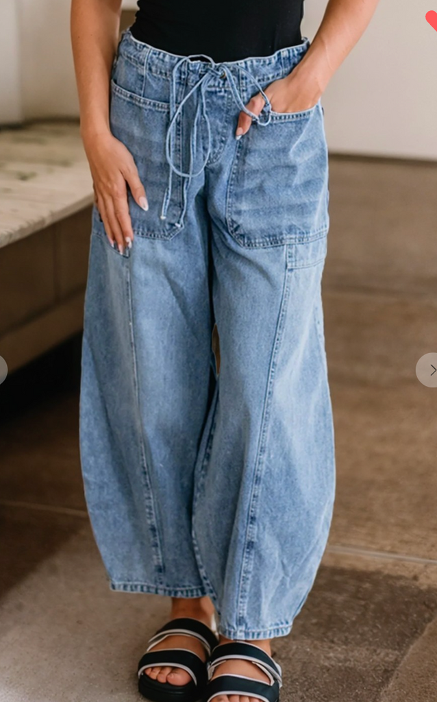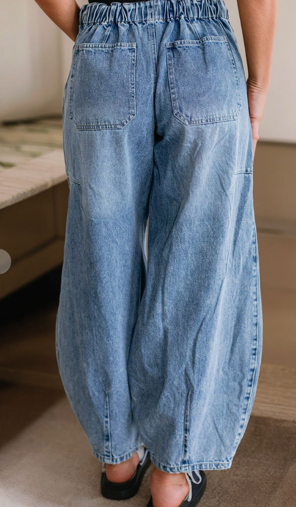 Barrel Jeans are all the rage and we love these ones! Easy to thrown on, drawstring waist, loose ft and cute barrel style legs.