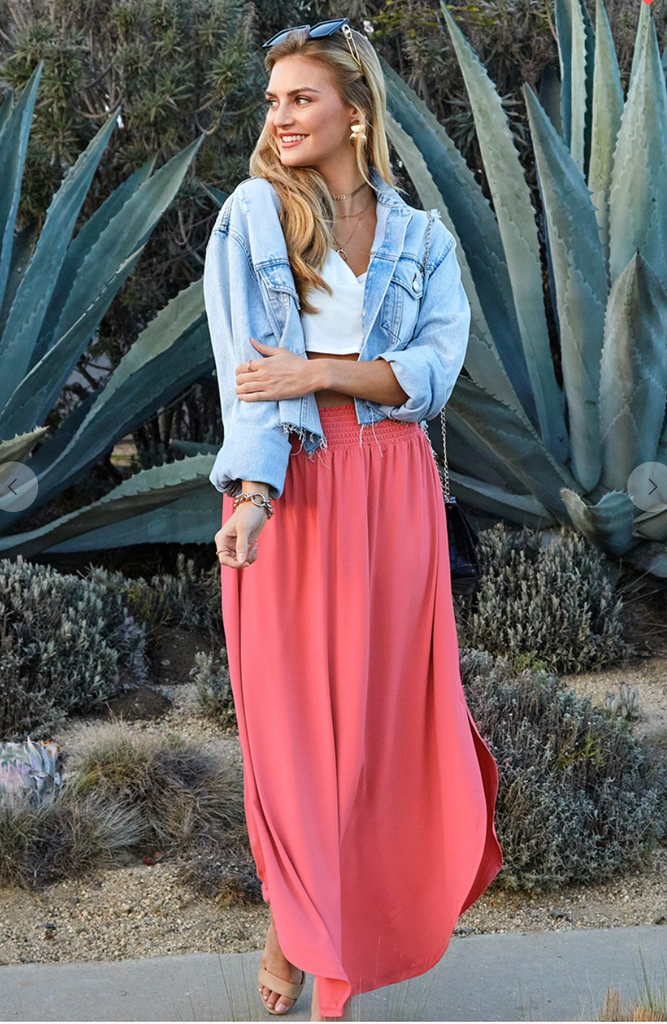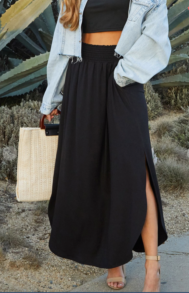 Smocking waist band detailed maxi skirt with side slit and side pocket will be your go to!