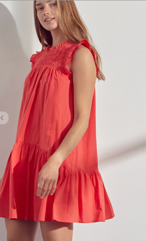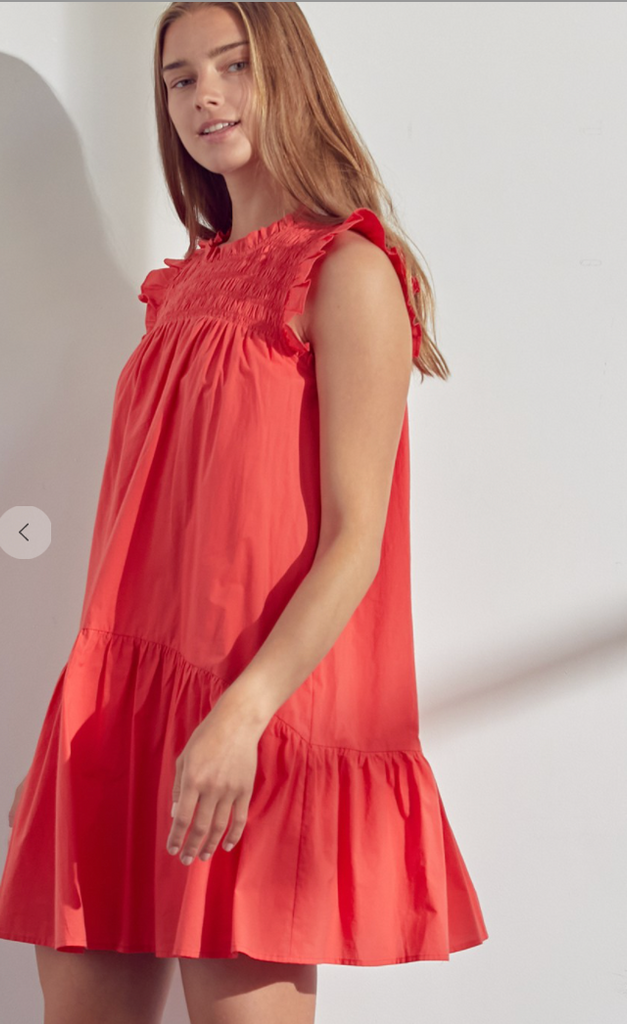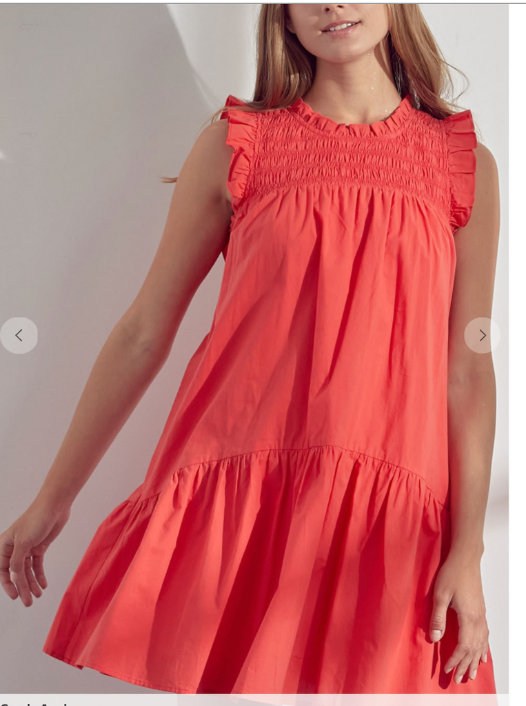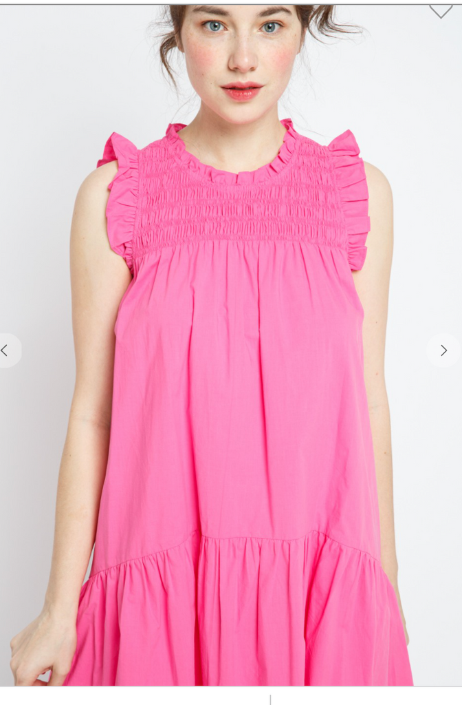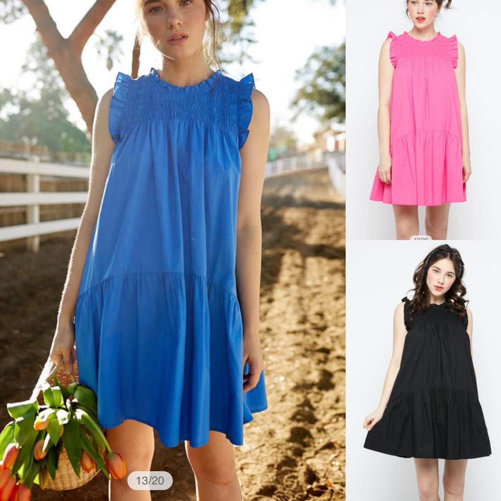 From Pink to Yellow to Blue you can't go wrong. The smocking yolk, Gauze shirred woven dress, Round ruffled neckline with ruffle cap sleeve, Two tiered with flounce hem and Seamed pockets on sides!