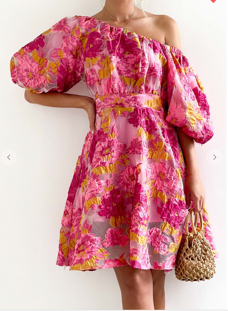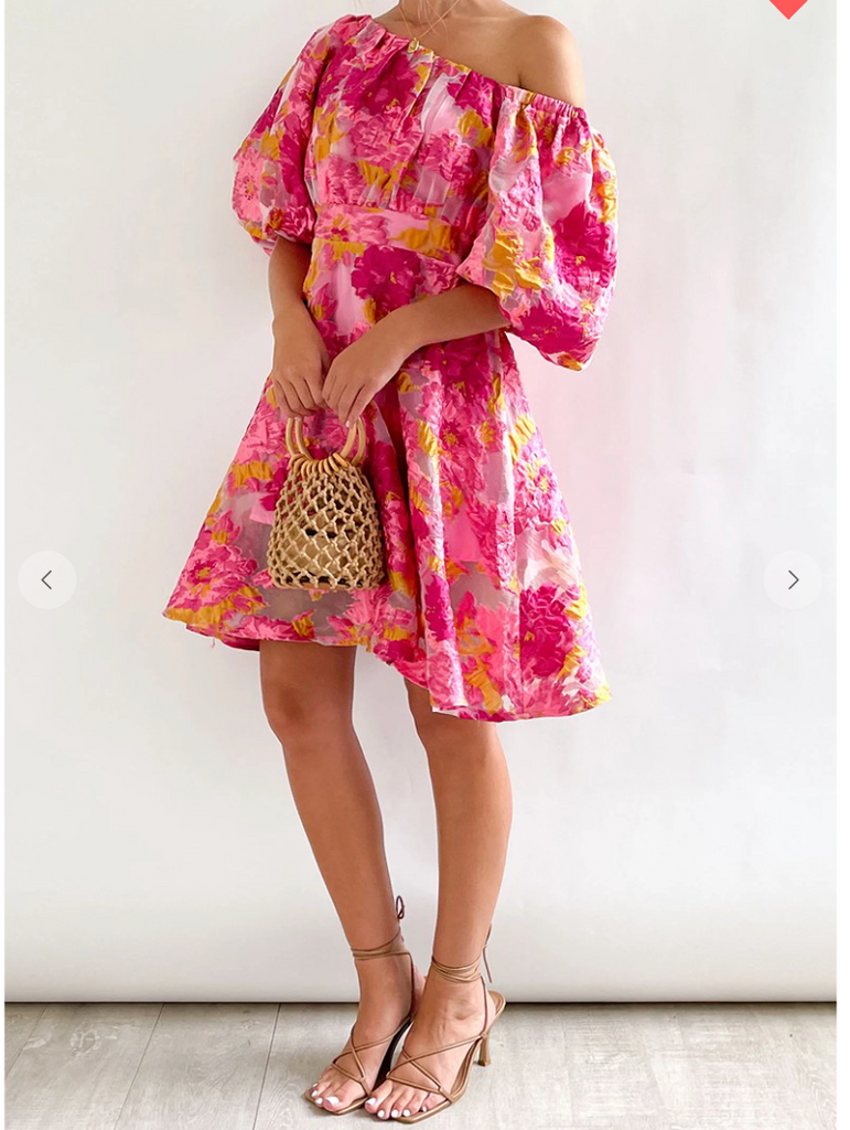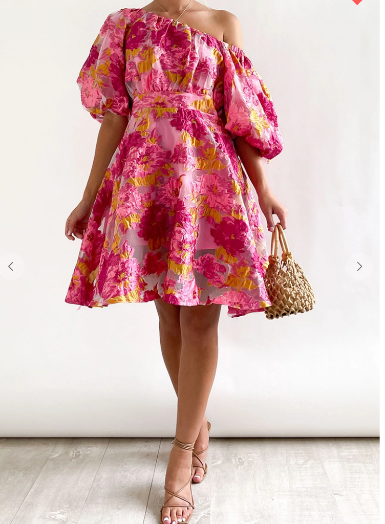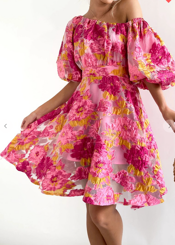 This darling organza off shoulder floral dress with a cute bubble Short Sleeve is to die for!! Love the fit and fabric and great length and coverage!