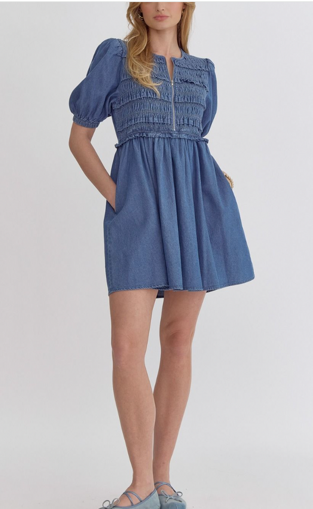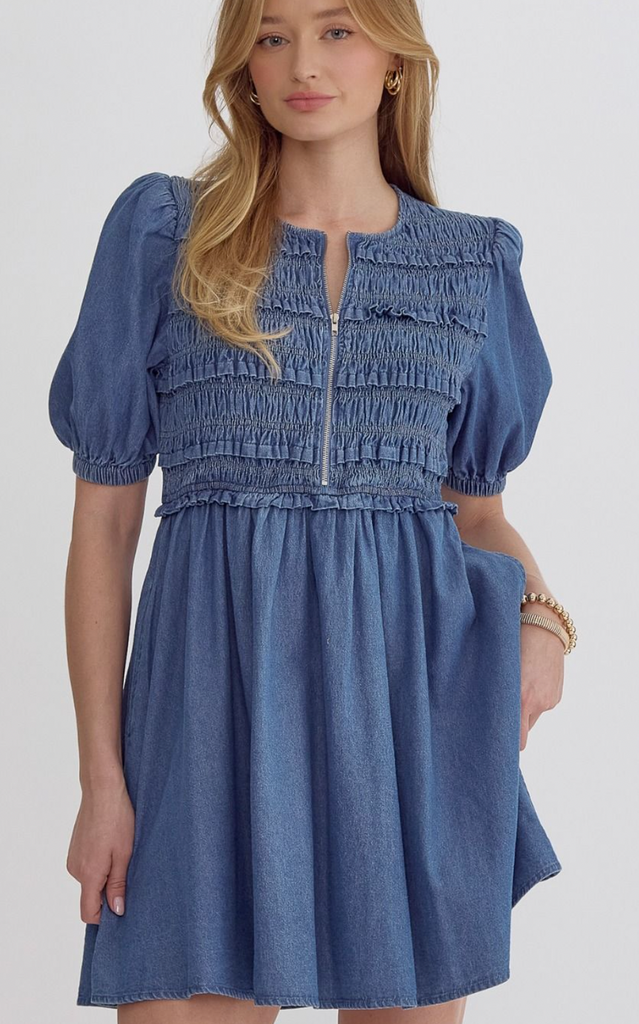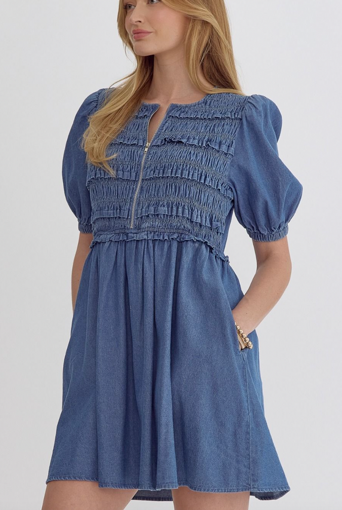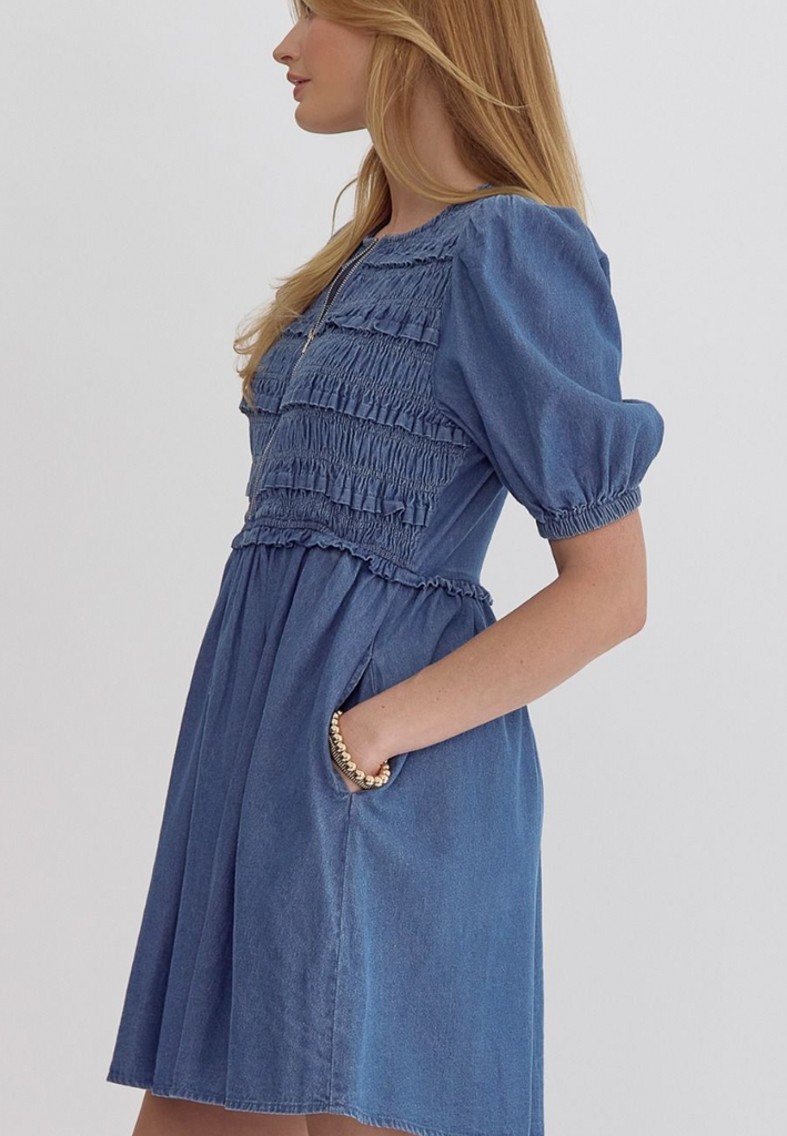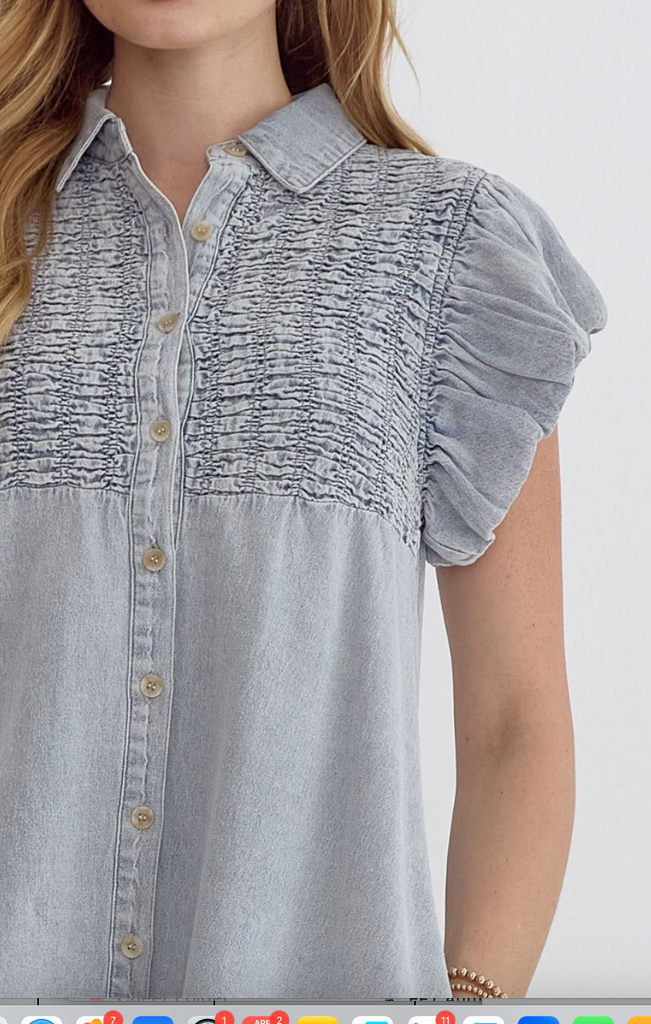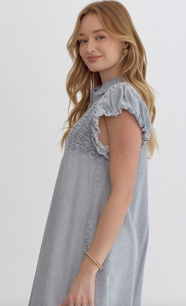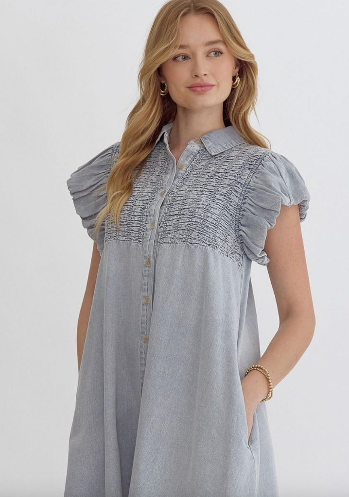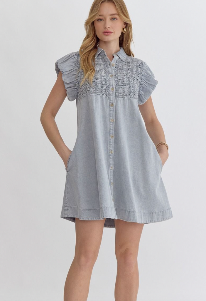 This is soo cute!! It is a Denim button down collar dress with ruffle sleeve and smocking detail. AND Pocket at side!!! THE BEST!!