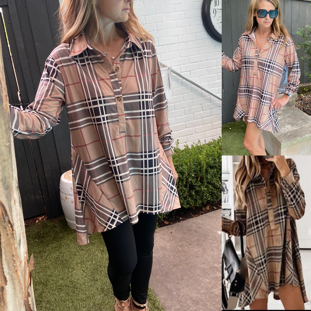 We of course love love this plaid and this style is a classic!! Button front placket, easy fit, long sleeve and high low style makes this a winner for all! Will be a few inches longer than shown. We are working the Manufacture and Designer to make it perfect for all of you!