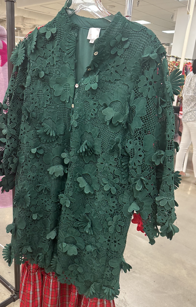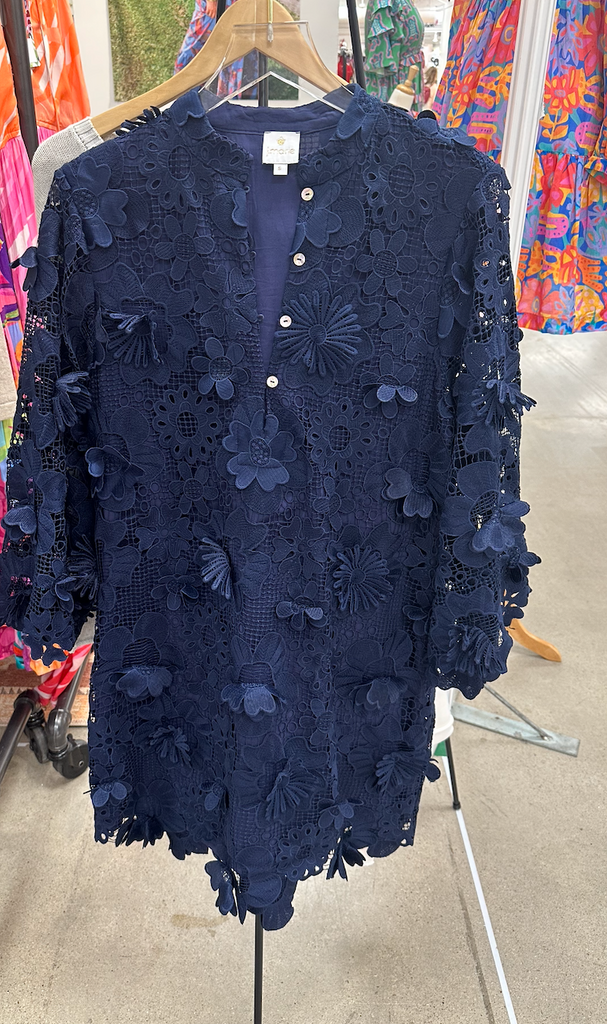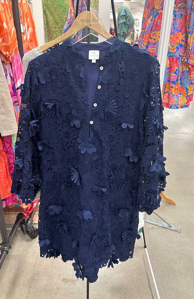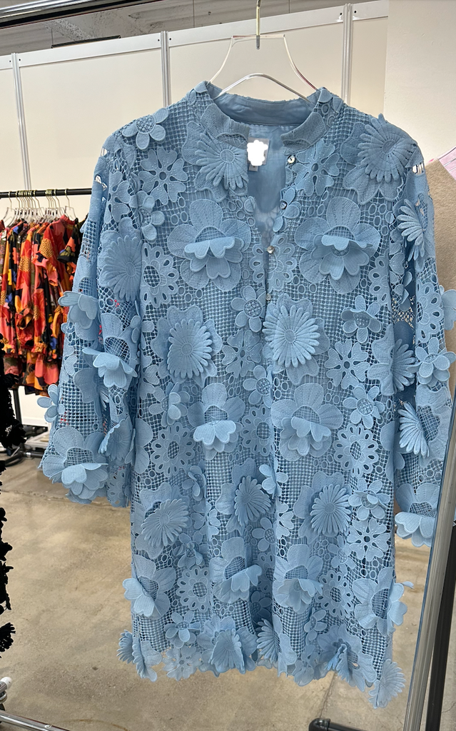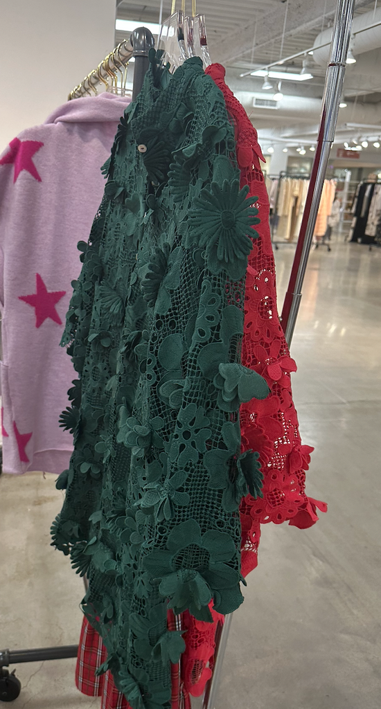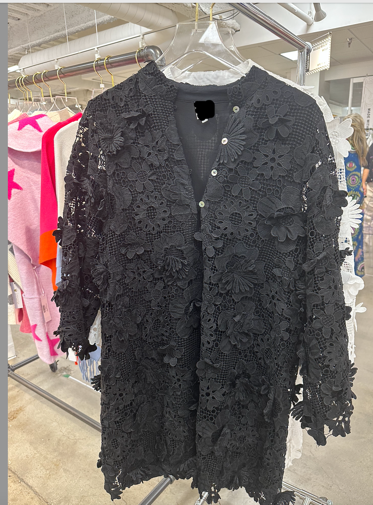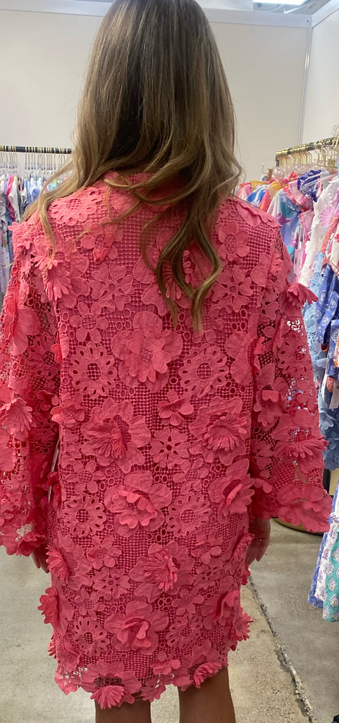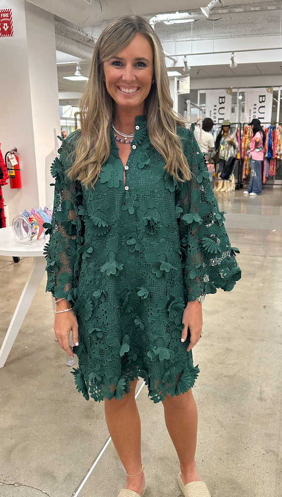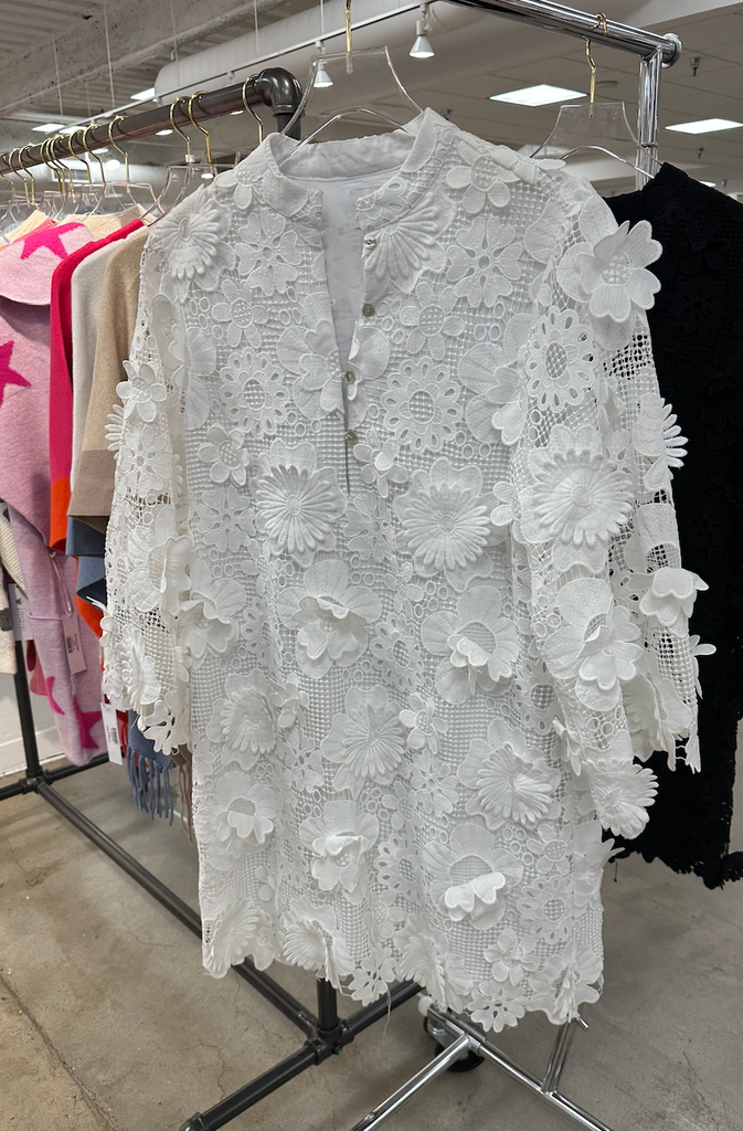 This Kaftan-style dress is crafted of intricate, three-dimensional floral lace. Long bell sleeves finish this '60s-inspired style!