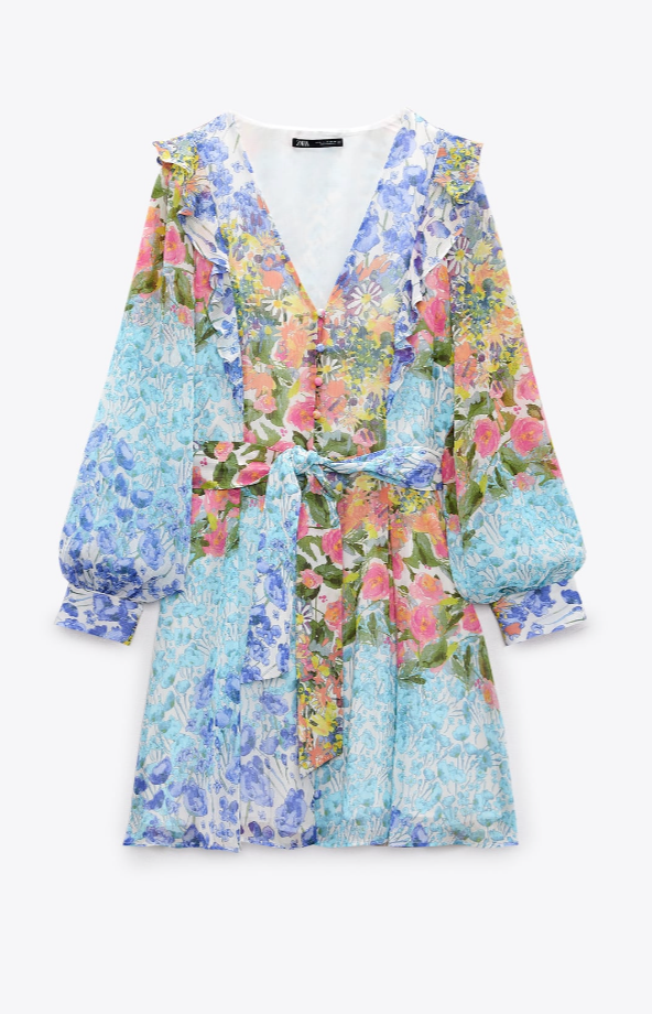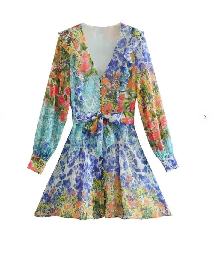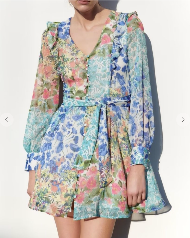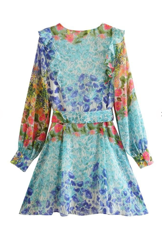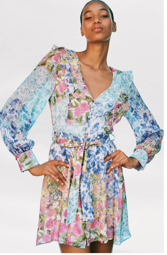 Madly in love with our new Milo Dress! It's a darling V-neck dress with long balloon sleeves with cuffs. Adore the ruffle detail and self-belt. It also has a contrasting inner lining and front closure with self lined buttons.