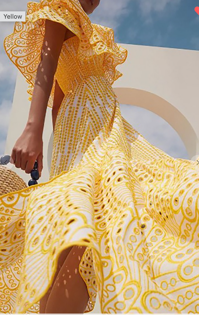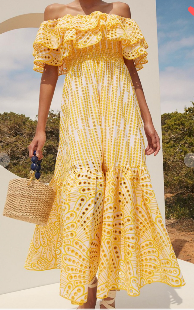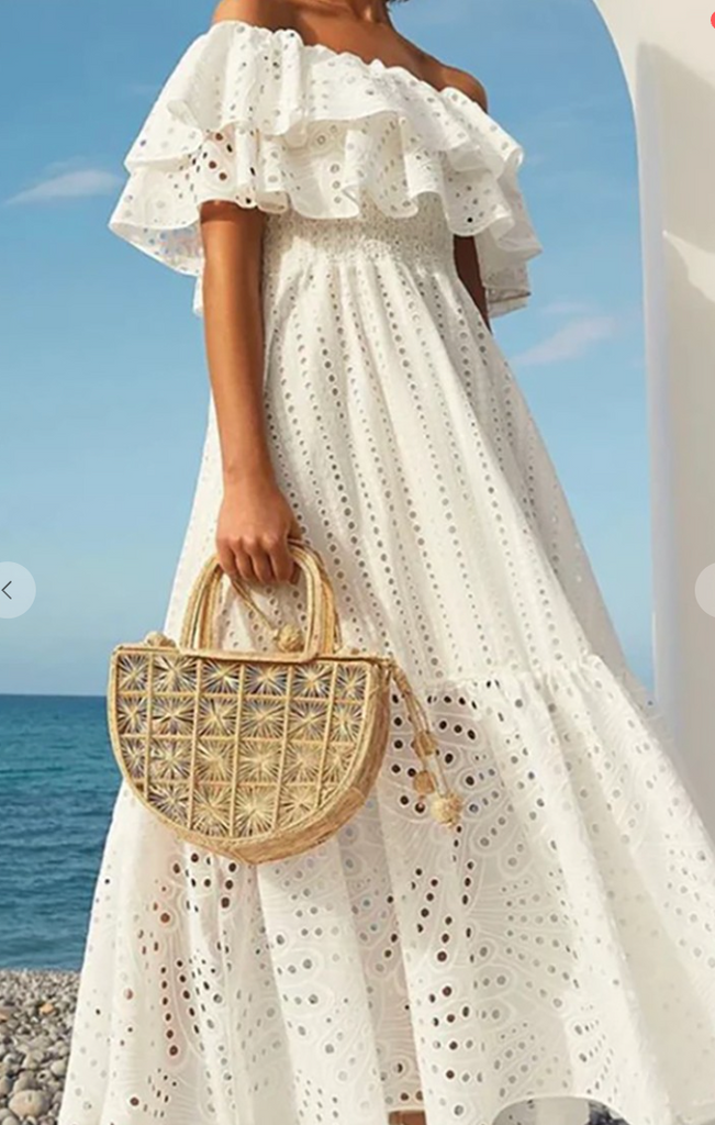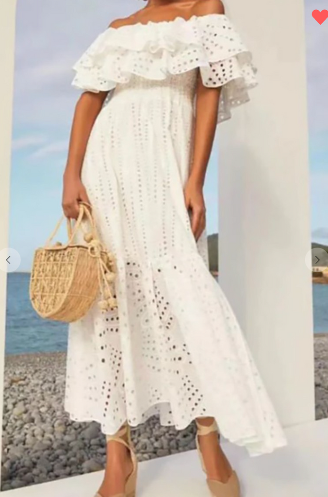 Our New Off Shoulder eyelet Maxi Dress  shows your summer shoulders amid pretty ruffles!