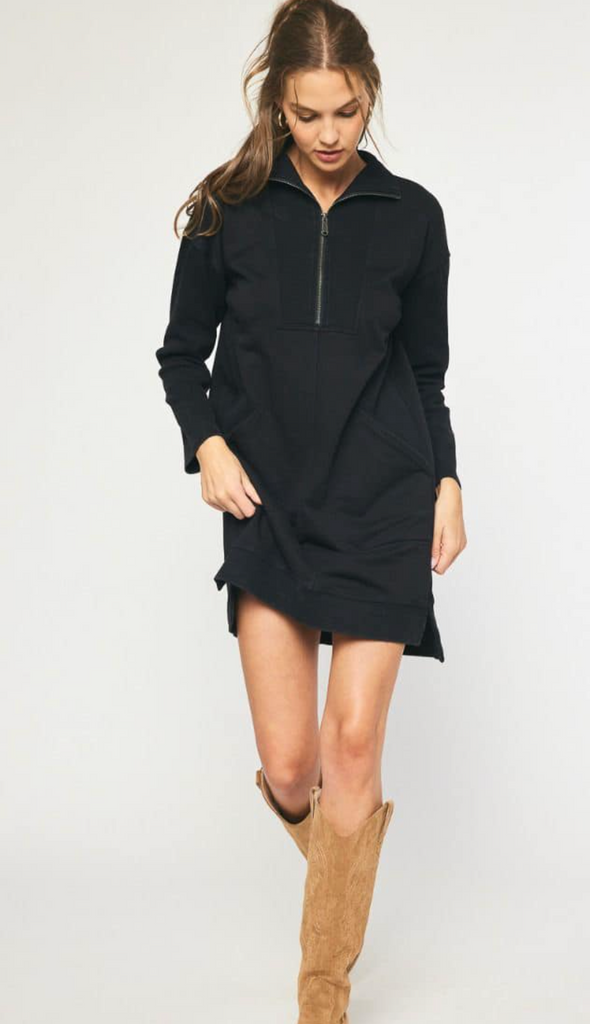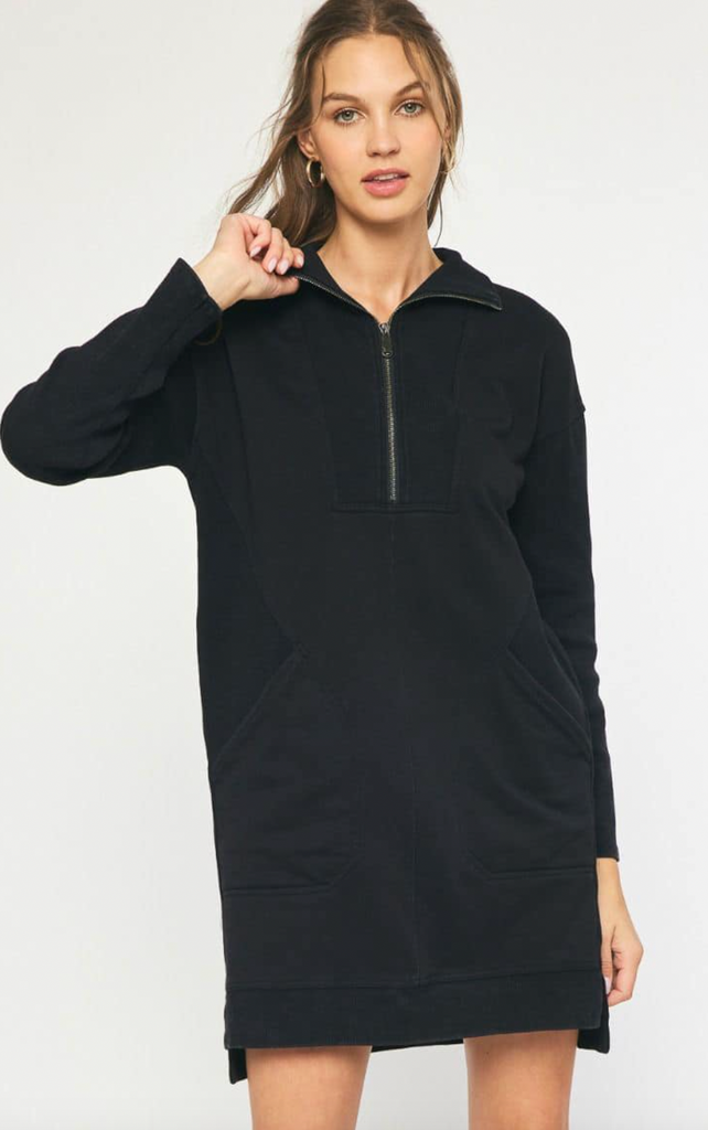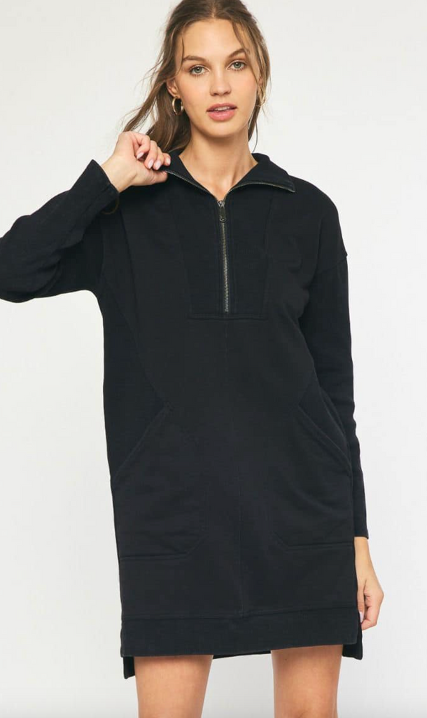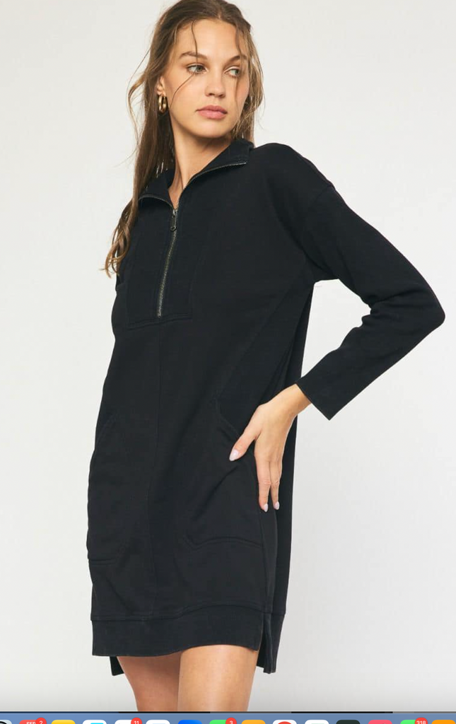 It is a sweatshirt dress with a stand-up collar and half-zip with dropped shoulders, long sleeves with trim at cuffs it has a soft brushed inside.