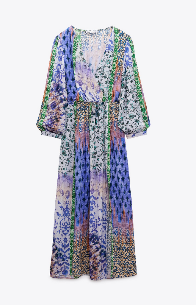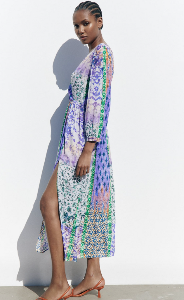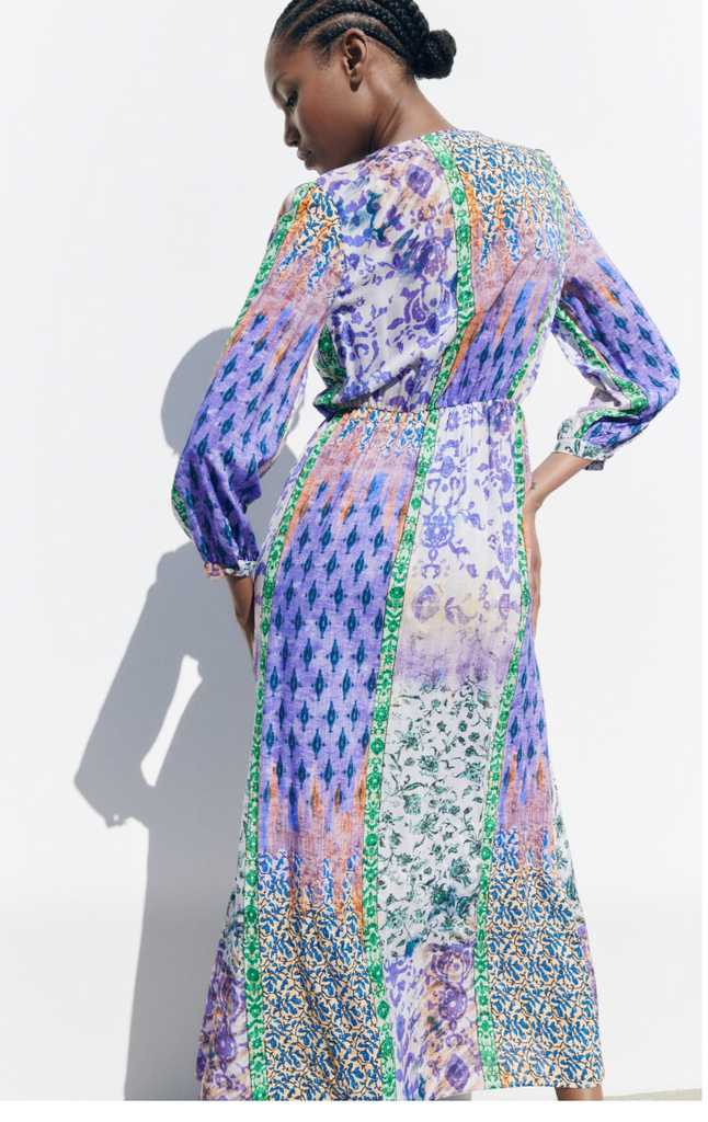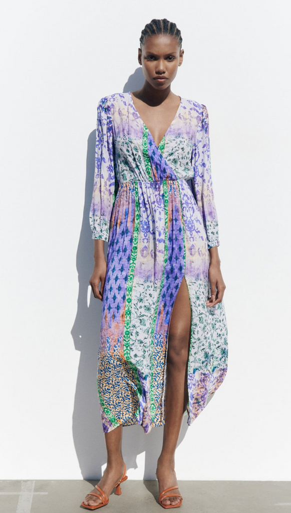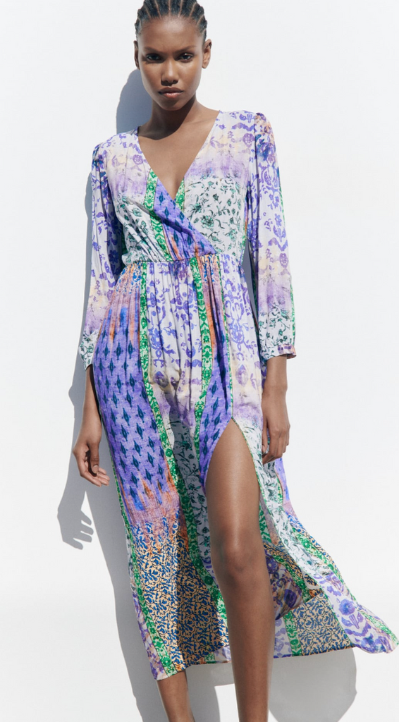 LOVING our Newest Midi Dress! This is such a great length and body style! Wrap V neck front, slit on side for great movement, and easy flowy sleeves, and gorgeous colors featuring green and purple and white!