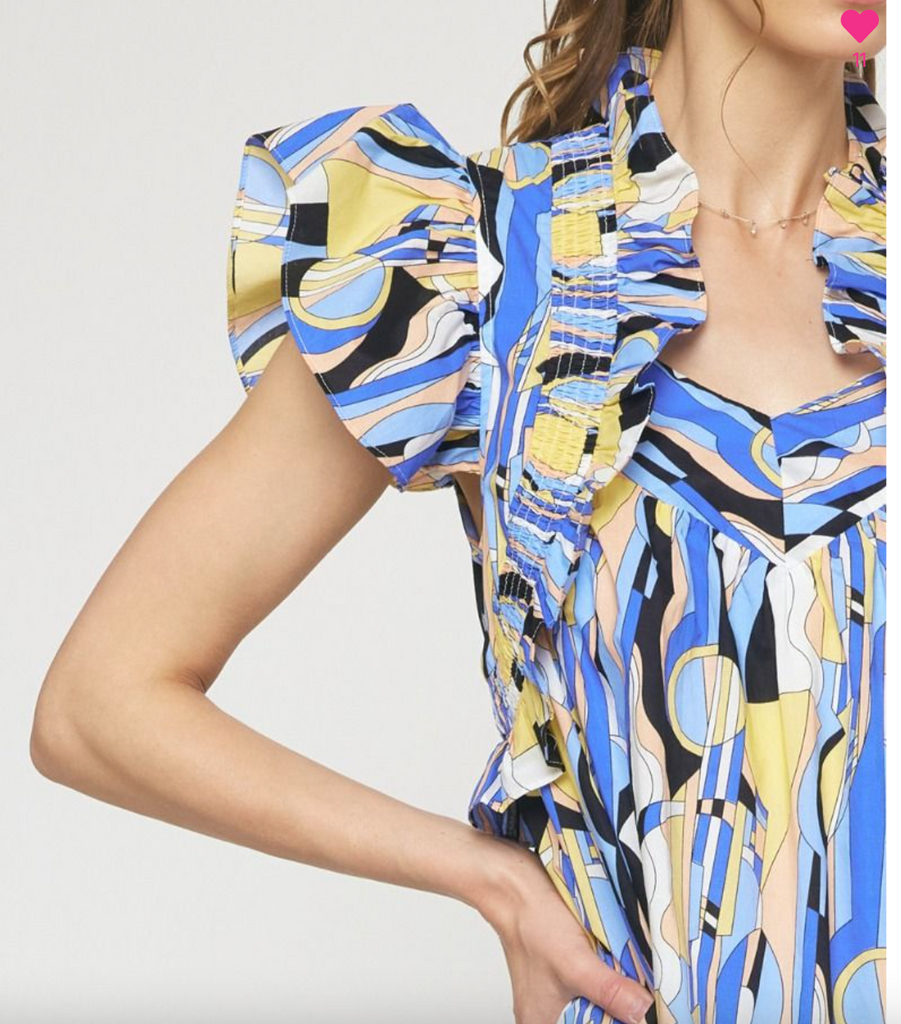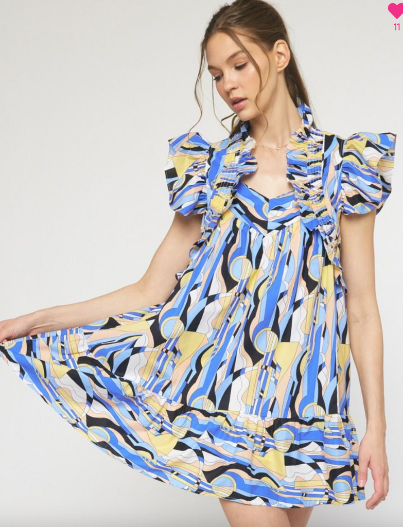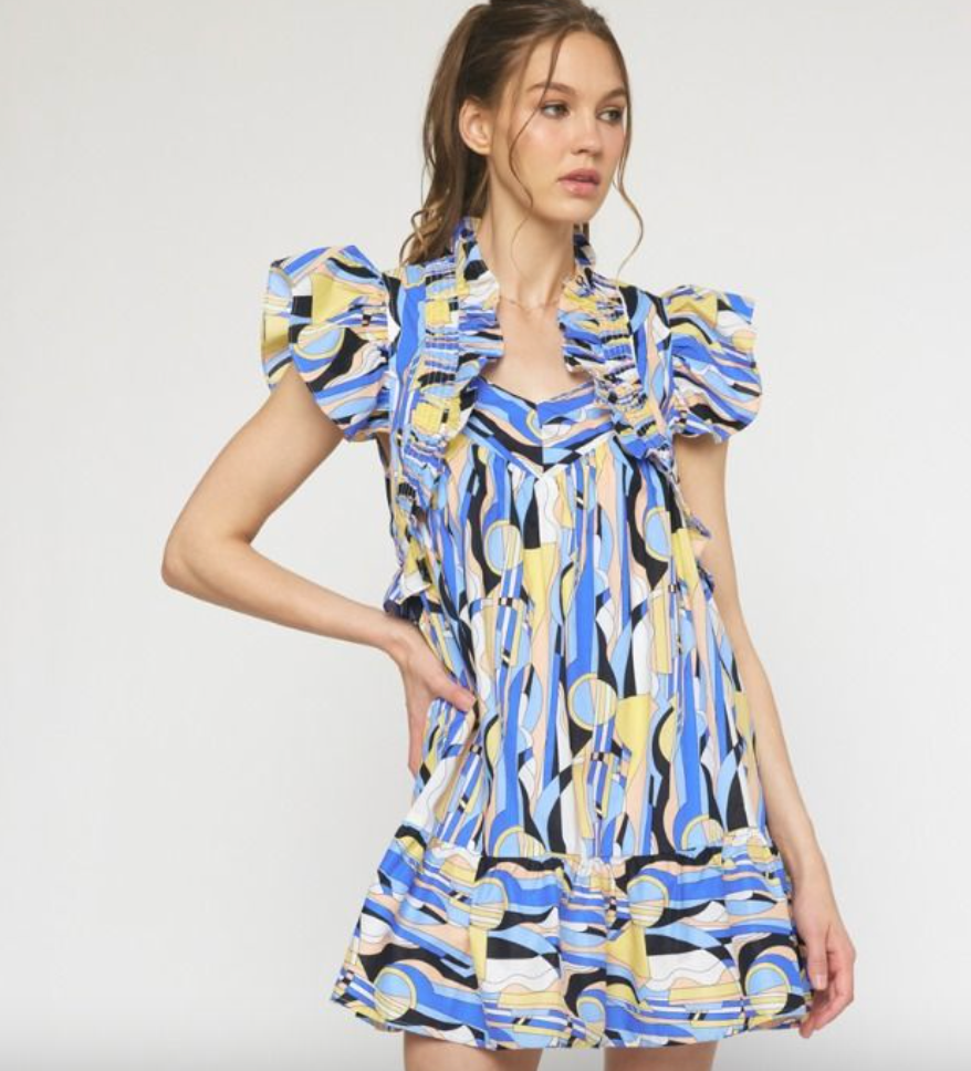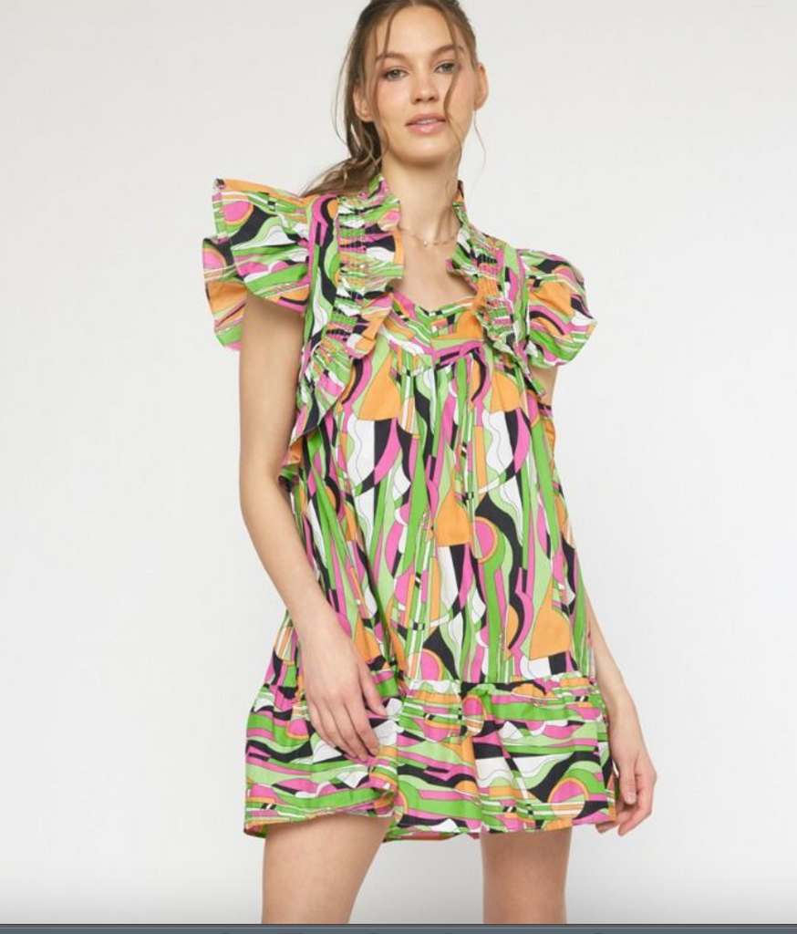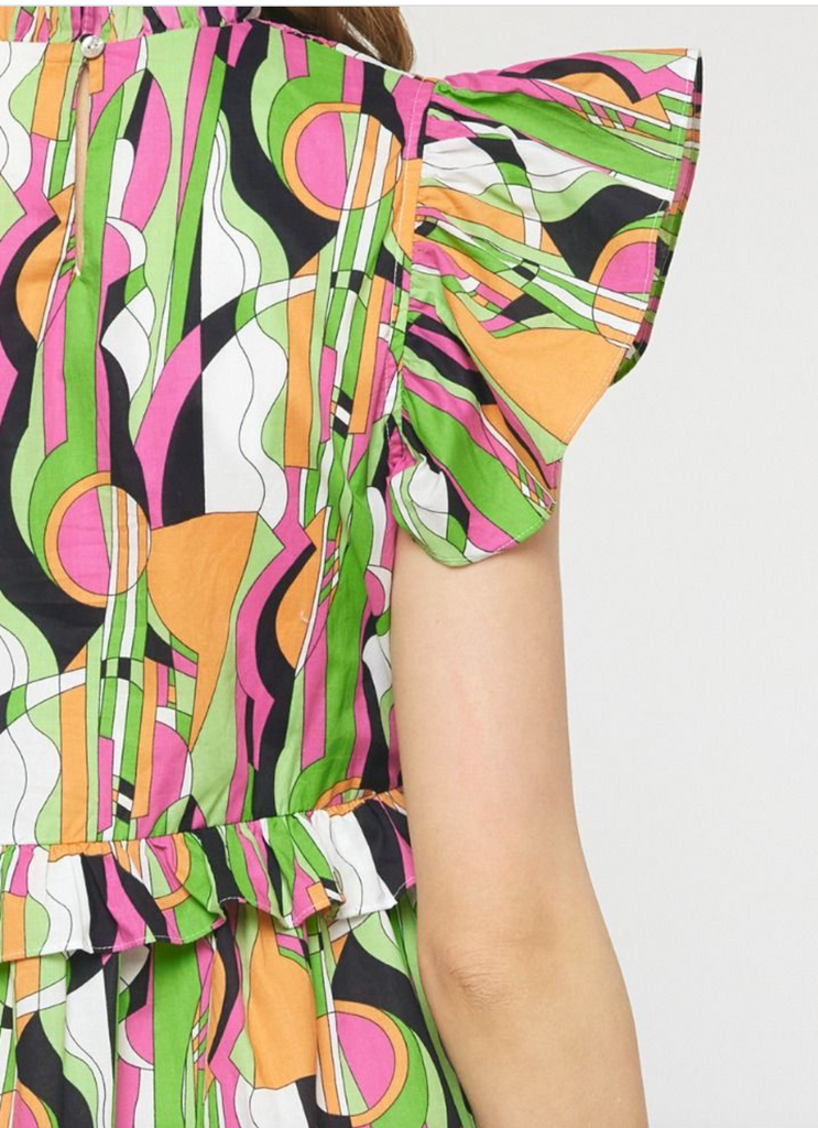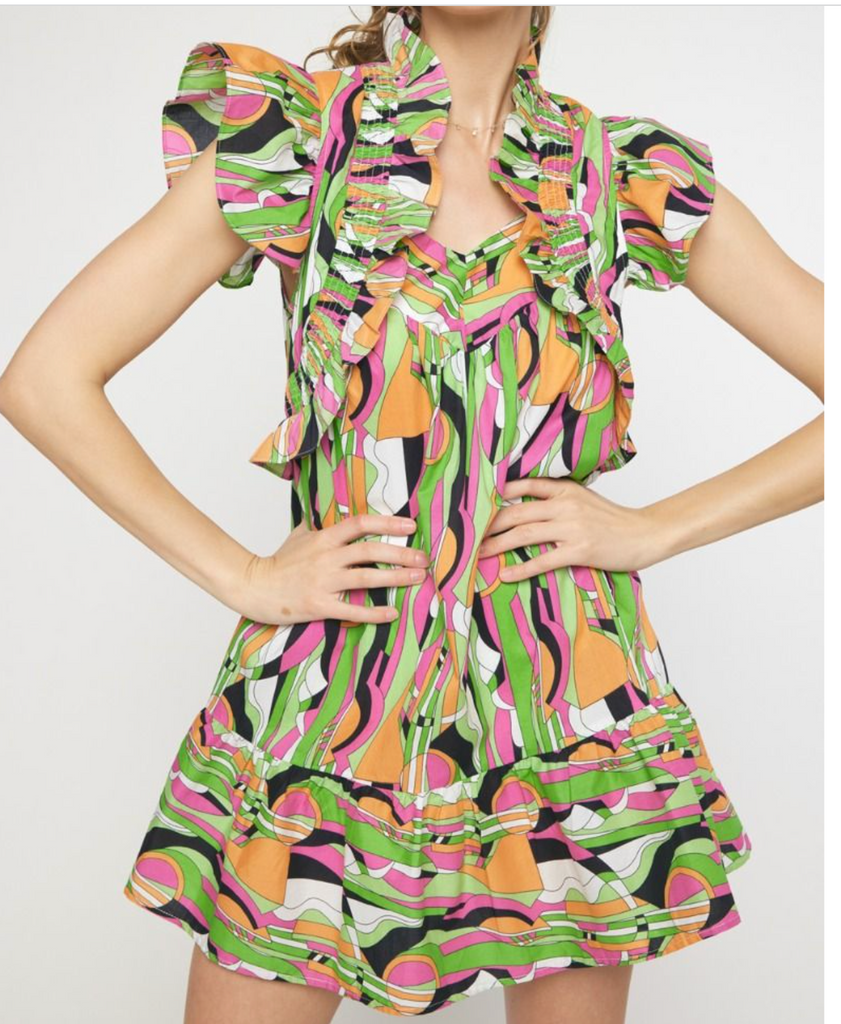 Printed short sleeve mini dress featuring ruffle detail at sleeve and center. Button closure at back. Lined. Woven. Non-sheer. Lightweight.