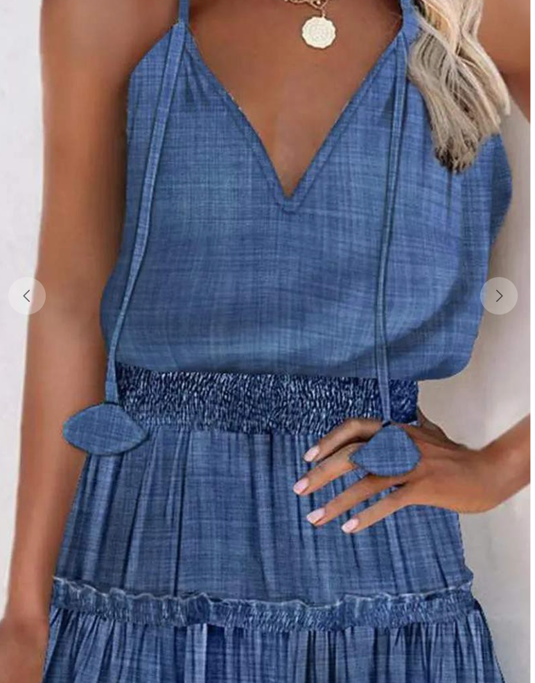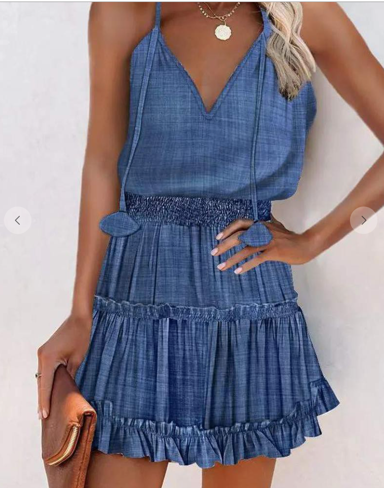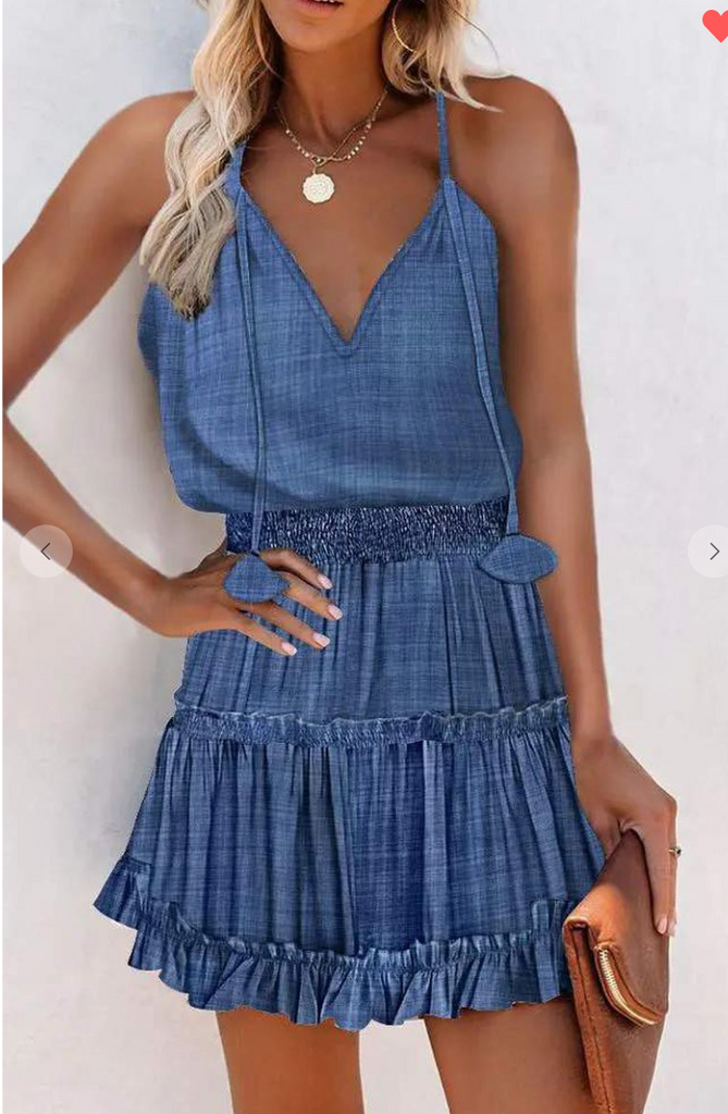 Its HOT! Keep it Cool in our RUFFLE HEM SHIRRED WAIST CAMI DRESS! This Darling A Line Style has a V Neck, adjustable ties at the sleeves, elastic