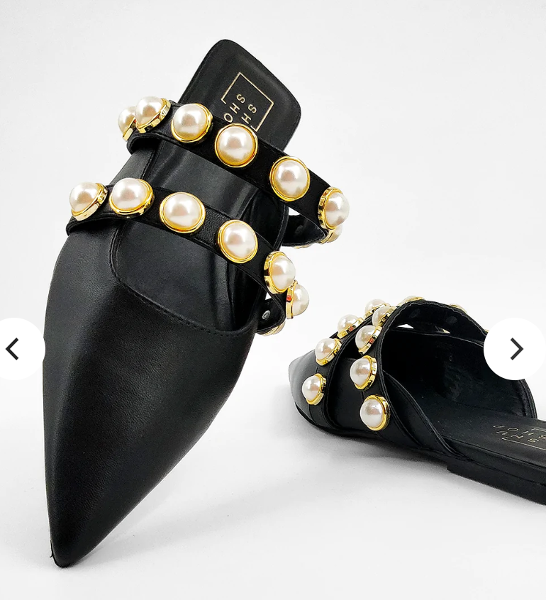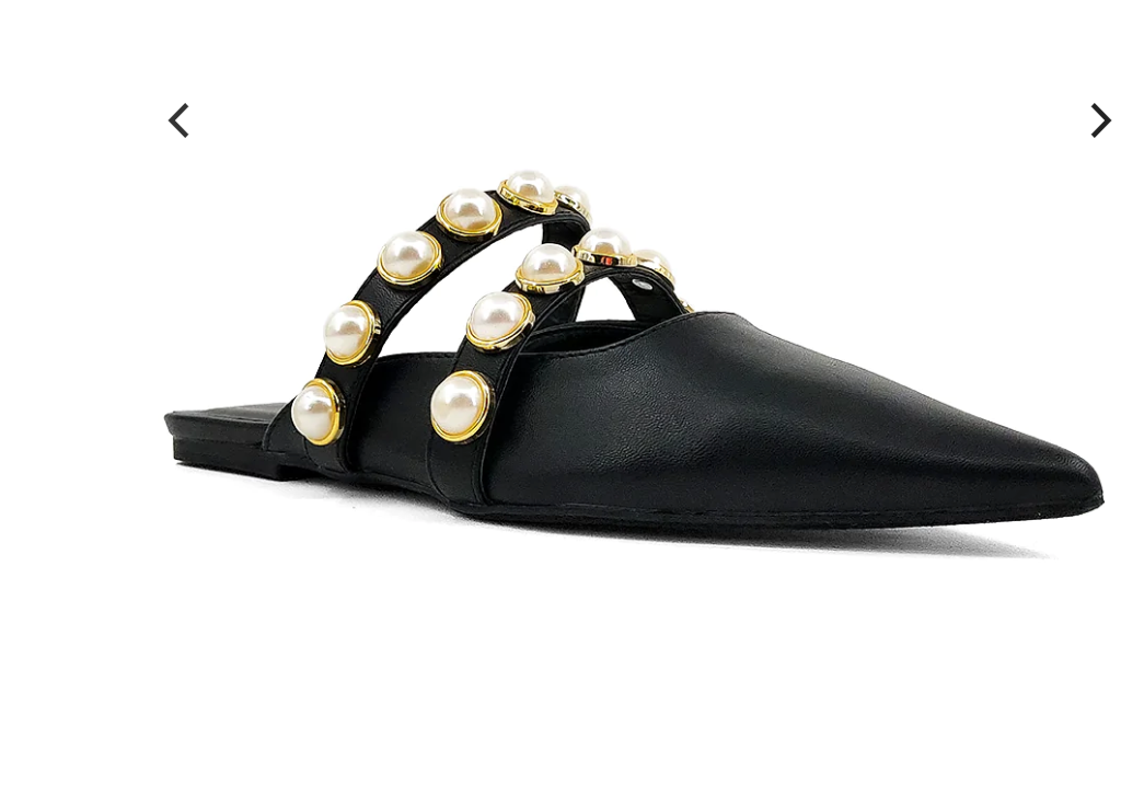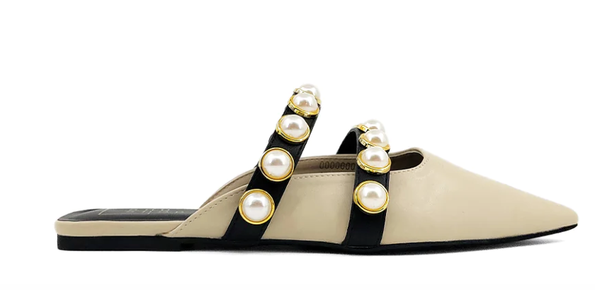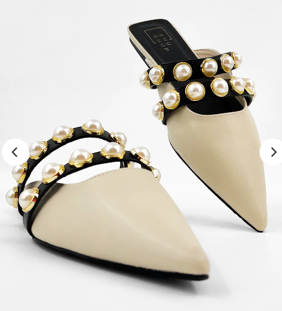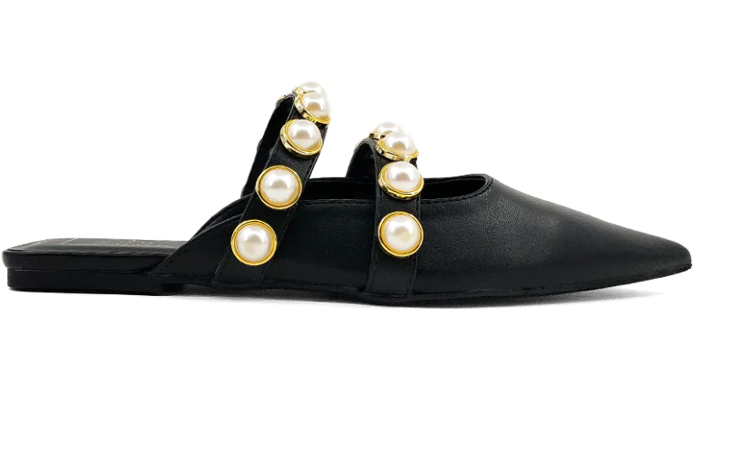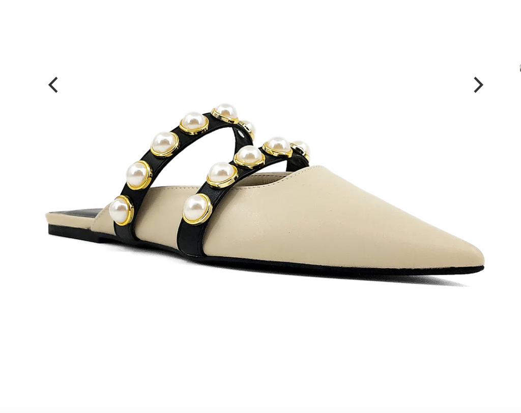 PEARLS are trending and Our AURA pointed-toe ballerina mules are crowned with two faux leather straps encrusted with pearl studs. The CUTEST MULES for a great transition into Fall!