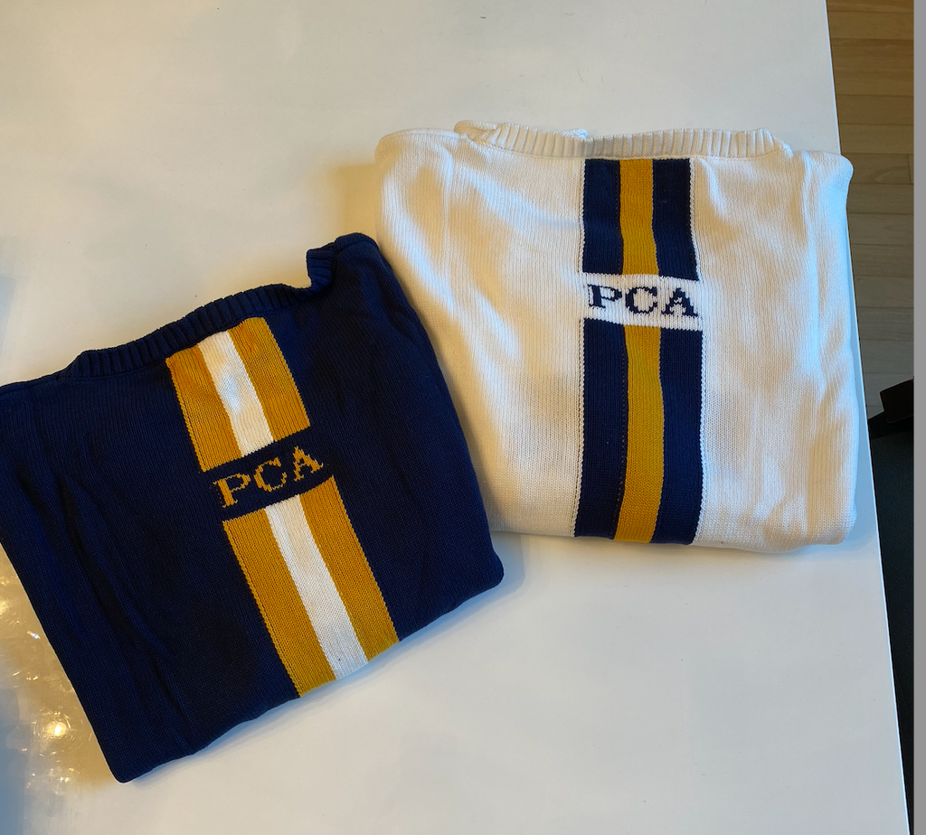 2. WHITE SWEATER - LIONS in NAVY trimmed in GOLD. The back has a detail stripe of Navy/Gold/Navy with PCA in NAVY