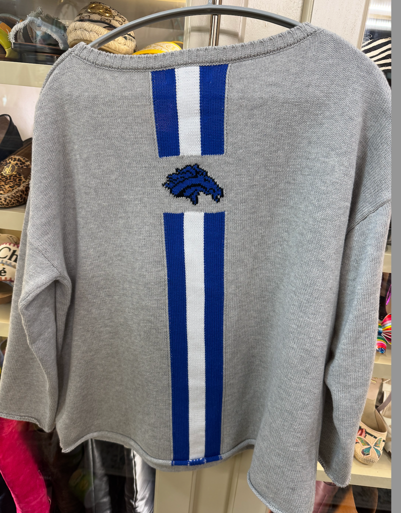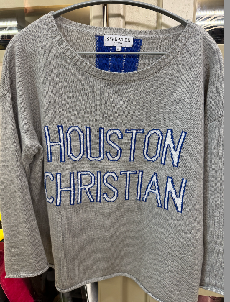 1. Grey Rolled hem and sleeve lightweight sweater is 100% cotton, and has the knitted in letters in the front that say "TEXAS LEGACY " in purple trimmed in teal.