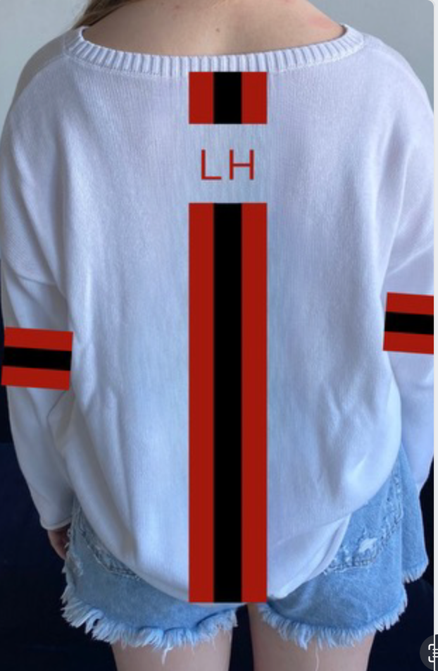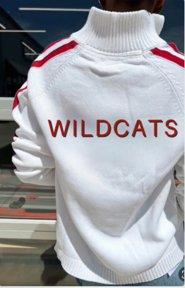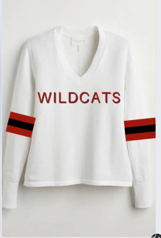 2. White sweater in a NEW v neck with WILDCATS in red trimmed in black and our signature stripe on the back of red/ black red and LH ain between the stripes. We have added the cute stripes of red/black /red on the sleeves.