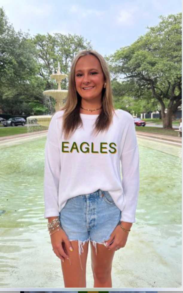 1. White Rolled hem and sleeve lightweight sweater is 100% cotton, and has the knitted in letters in the front that say "EAGLES" in green trimmed in gold