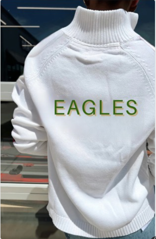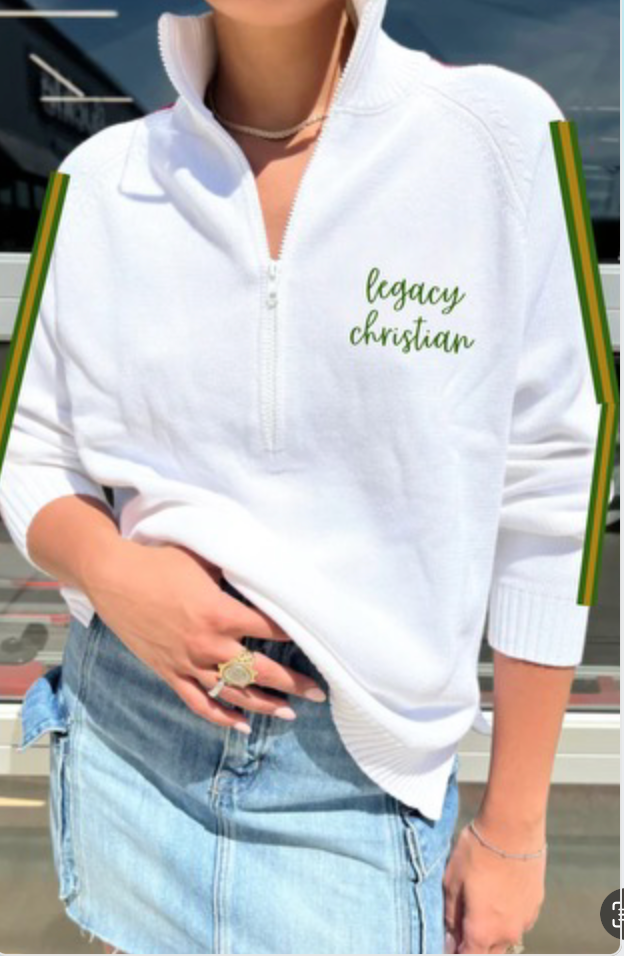 2. White 100% cotton 1/2 zip with Legacy Christian knitted in the front in green and EAGLES on the back in green trimmed in gold. Sleeves will have stripes of green/gold/white/gold/green
