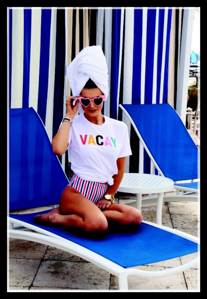 For those of you who are on a VACAY and those of you who want to be, then this shirt is for you! I love the Fun Bright colors, the  Crew Neck Softstyle and it is 10%  combed and ring spun cotton