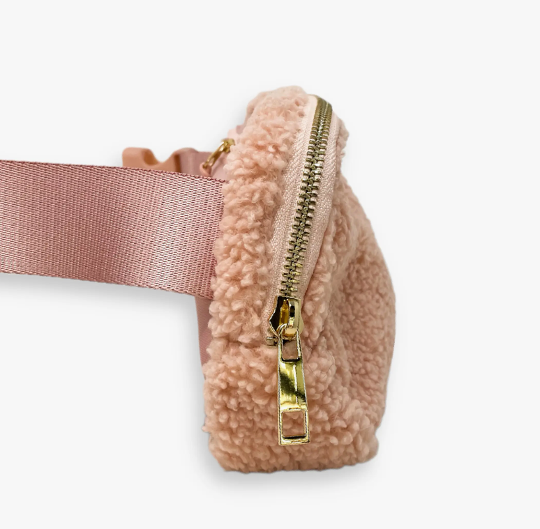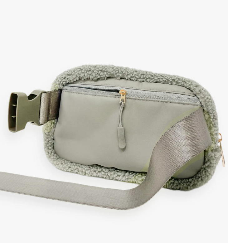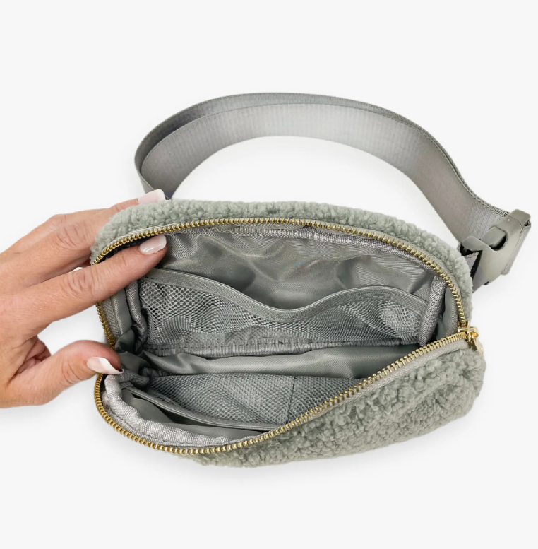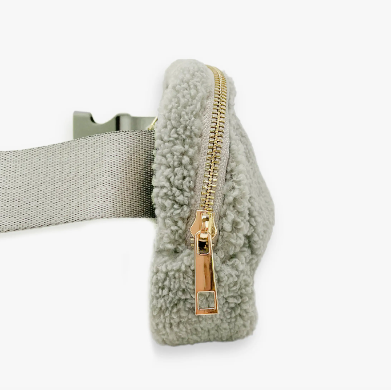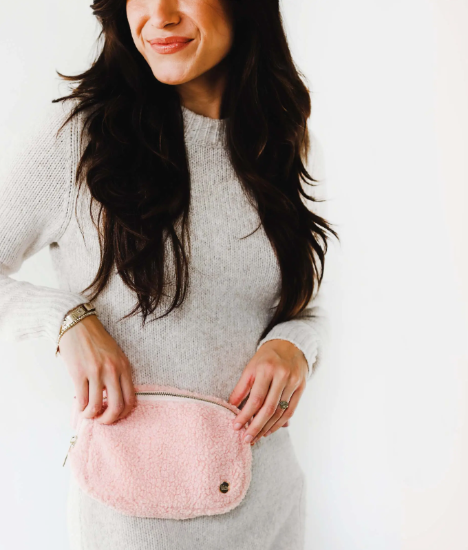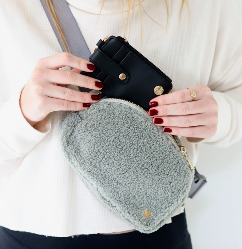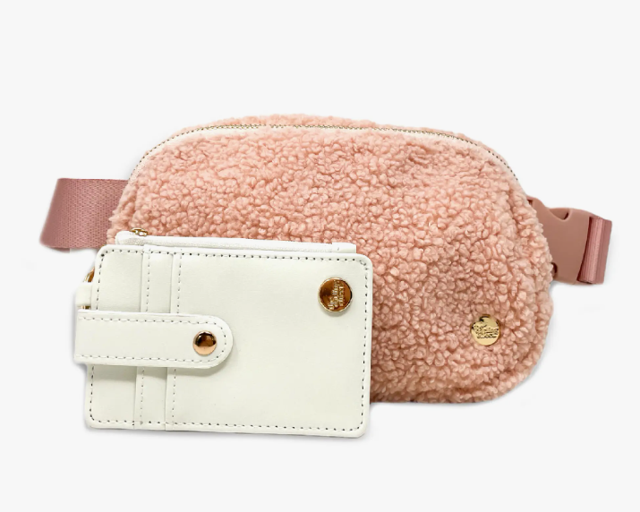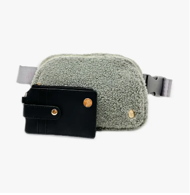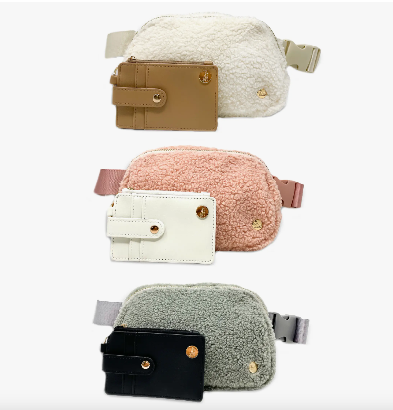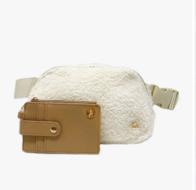Fabric: Body 100% Polyester Sherpa Lining 100% Polyester Mesh 100% Polyester Sherpa Fabric, Textured Limited quantities available. Our new COZY All You Need Belt Bag + Wallet comes in 3 colors: Cozy Cream, Cozy Grey, and Cozy Blush.