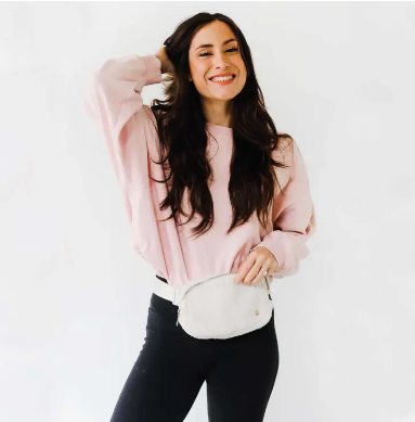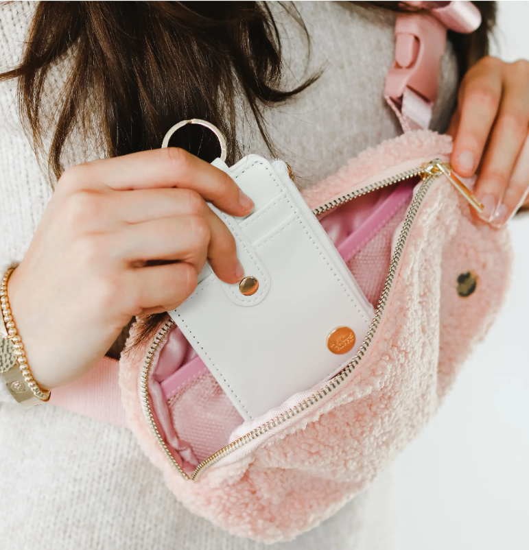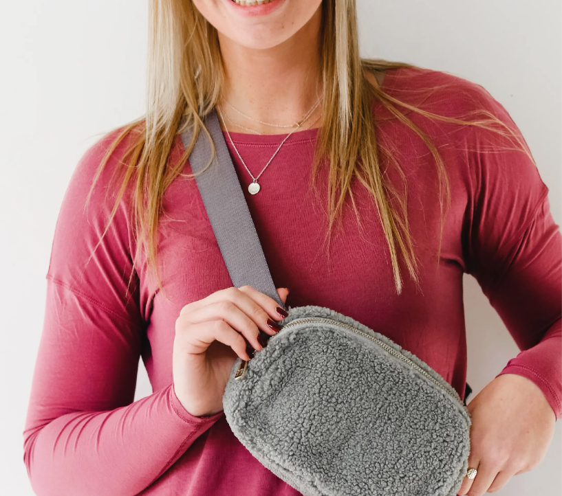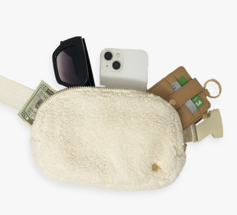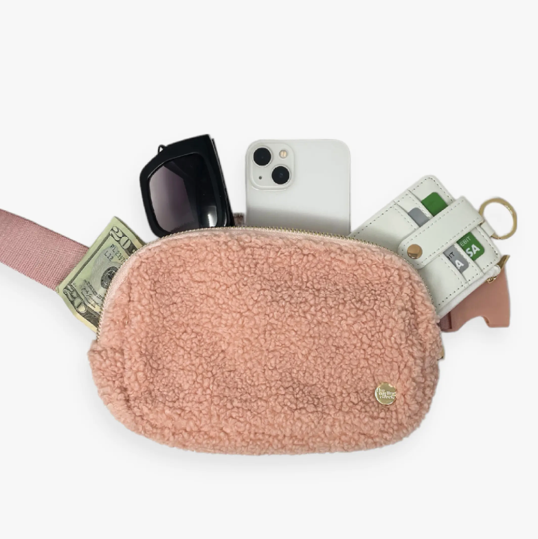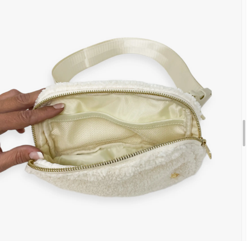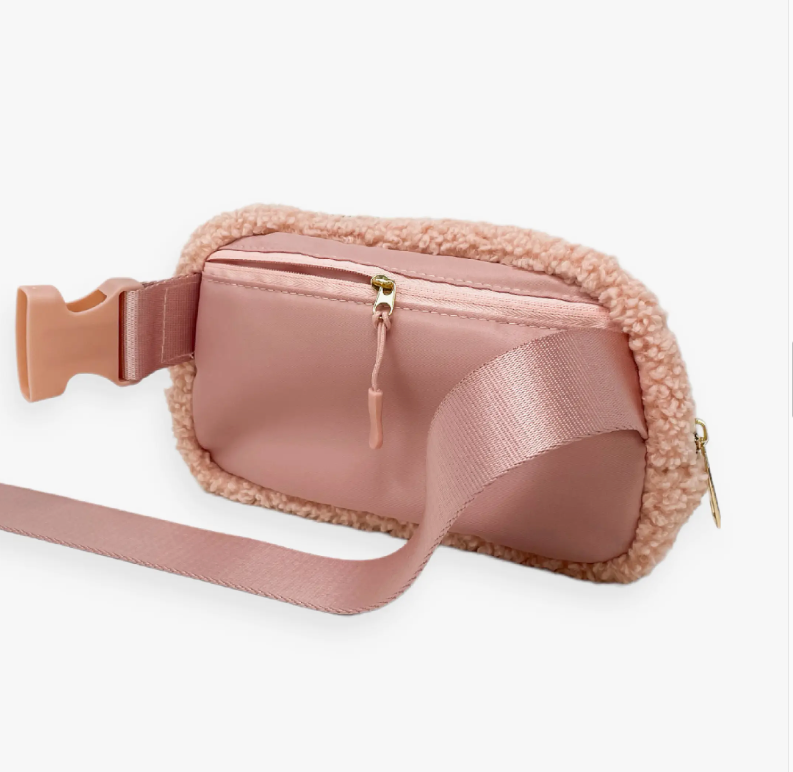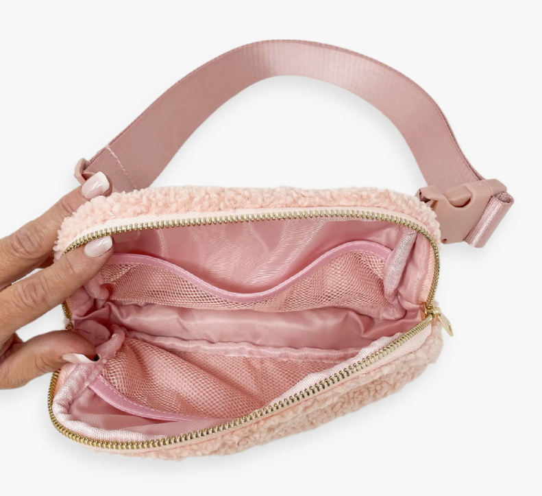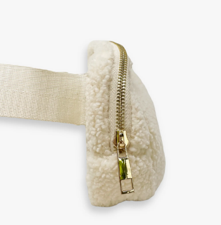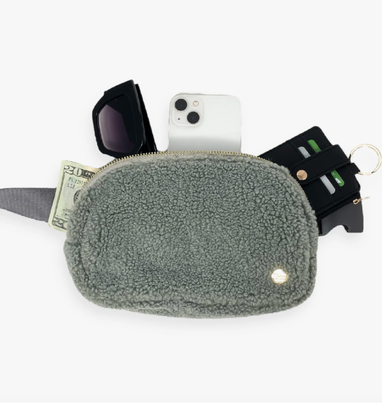 Fabric: Body 100% Polyester Sherpa Lining 100% Polyester Mesh 100% Polyester Sherpa Fabric, Textured Limited quantities available. Our new COZY All You Need Belt Bag + Wallet comes in 3 colors: Cozy Cream, Cozy Grey, and Cozy Blush.