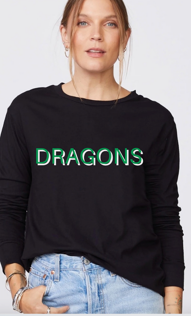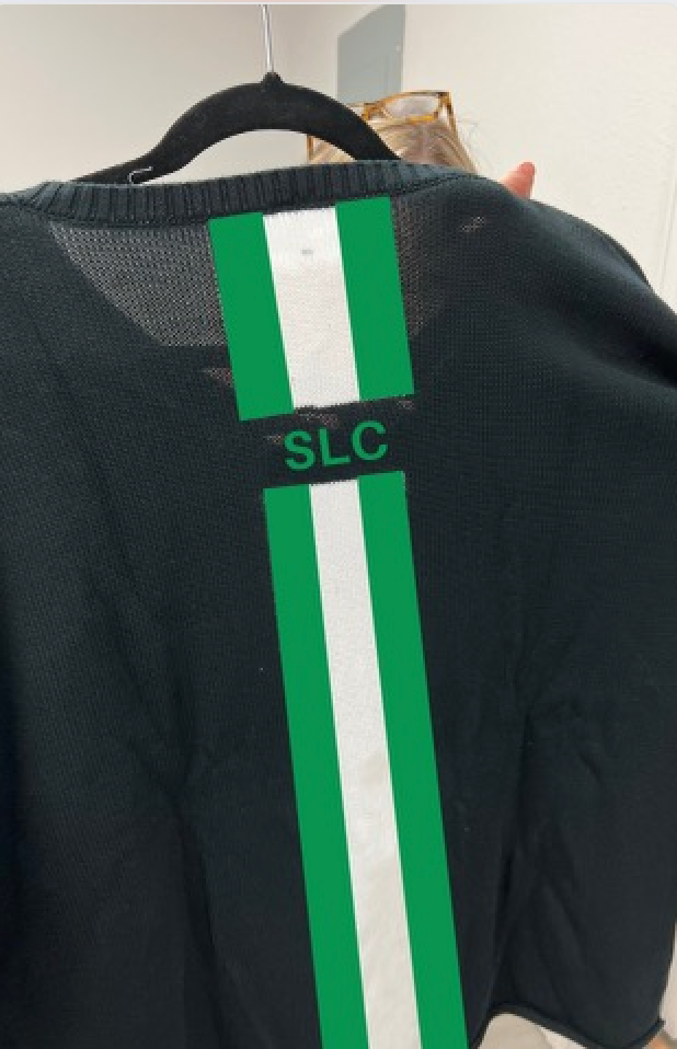 2. BLACK: It is 100% cotton, lightweight, rolled hem and cuffs and has the knitted letters in the front that say "DRAGONS" in GREEN trimmed in White. Then we we are adding the detail stripe of the SCHOOL COLORS in the back Green/ White/ Green with SLC IN GREEN. It will be your favorite Southlake Sweater!