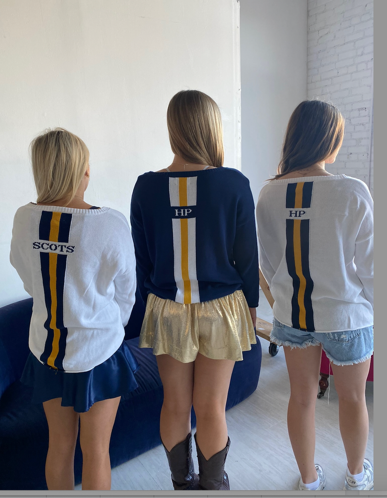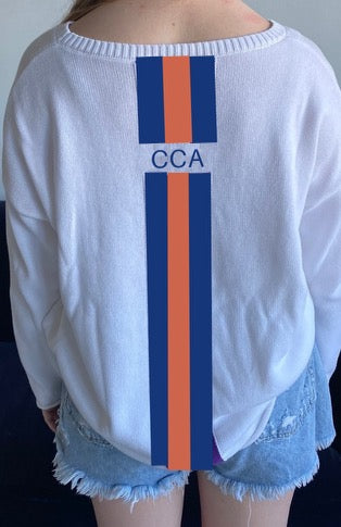 It is 100% cotton, lightweight, rolled hem and cuffs and has the knitted letters in the front that say "COUGARS " in BLUE trimmed in ORANGE. Then we we are adding the detail stripe of the SCHOOL COLORS BLUE/ORANGE/BLUE in the back with CCA IN BLUE. It will be your favorite COVENANT Sweater!