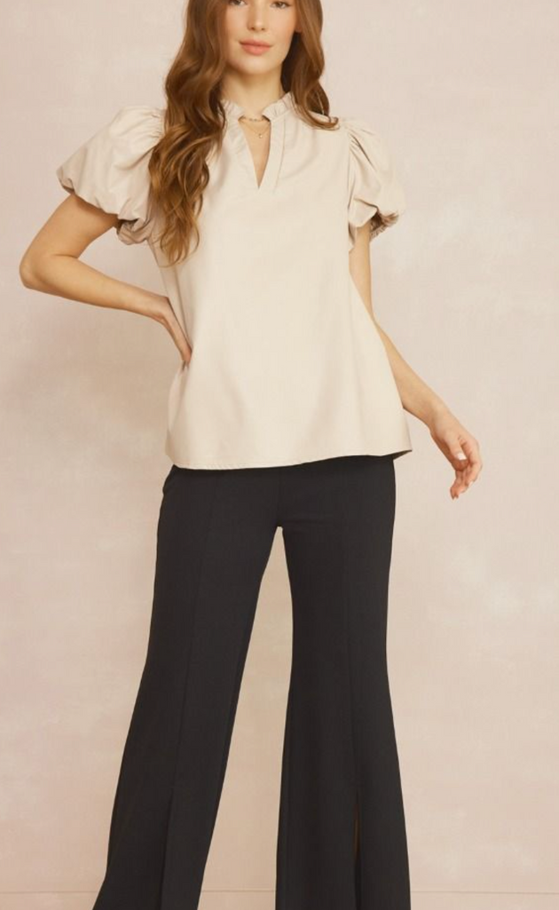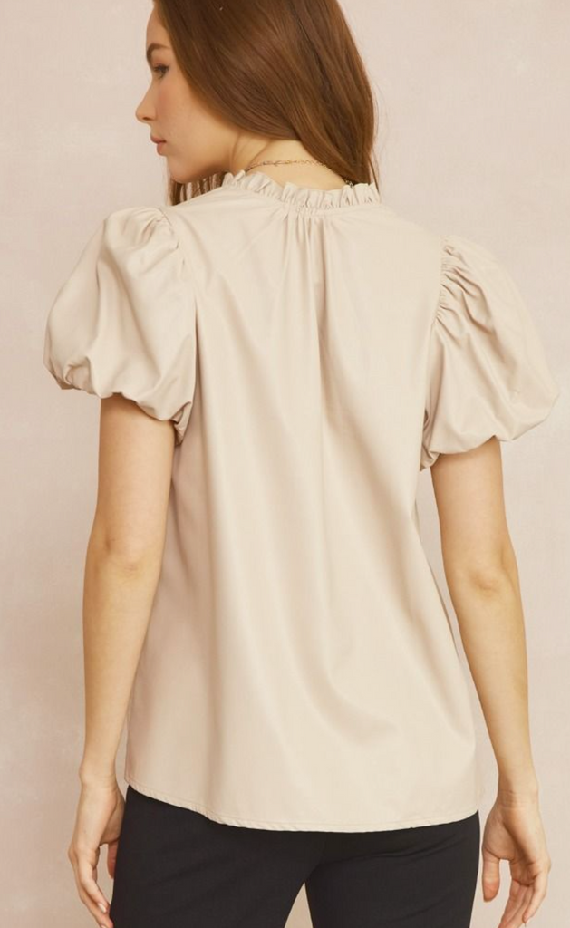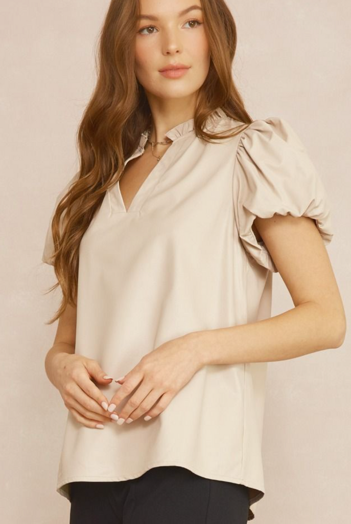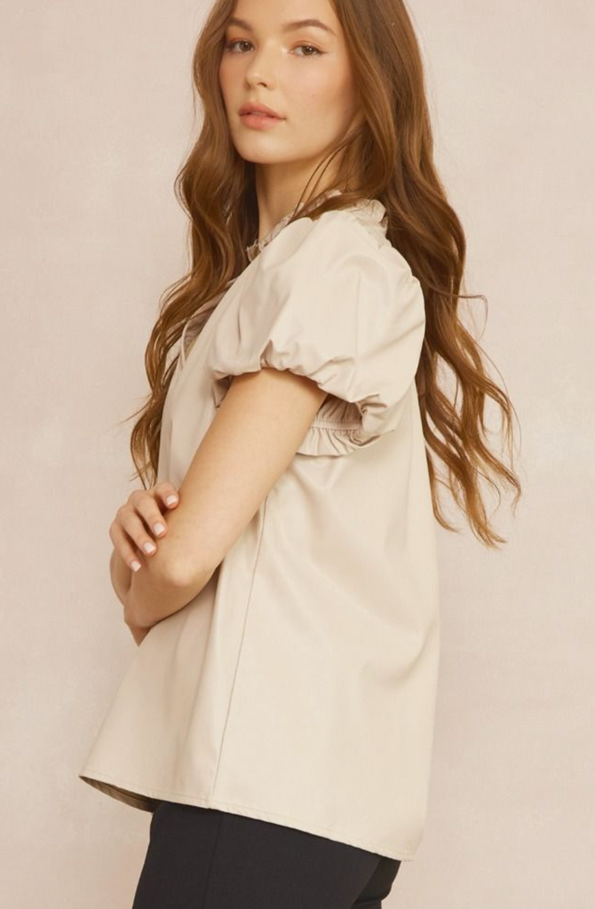 This darling Vegan leather short sleeve top is a dream! Lightweight V neck and a ruffle detail at the neckline make it an easy wear when its still so hot !