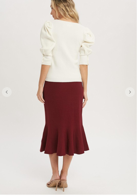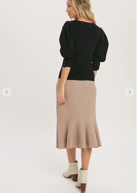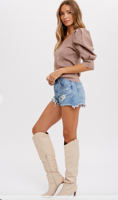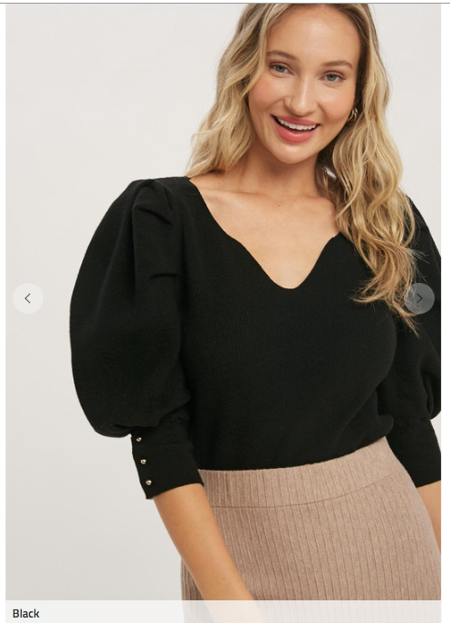 We love the puff short sleeve with button cuffs, v-neckline and relaxed fit.
