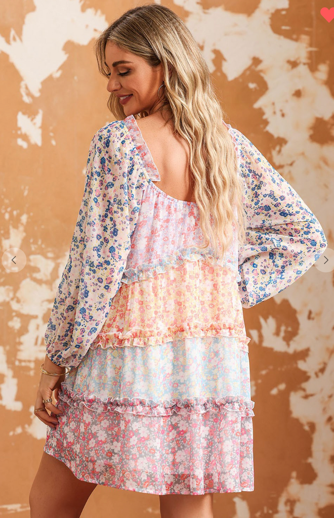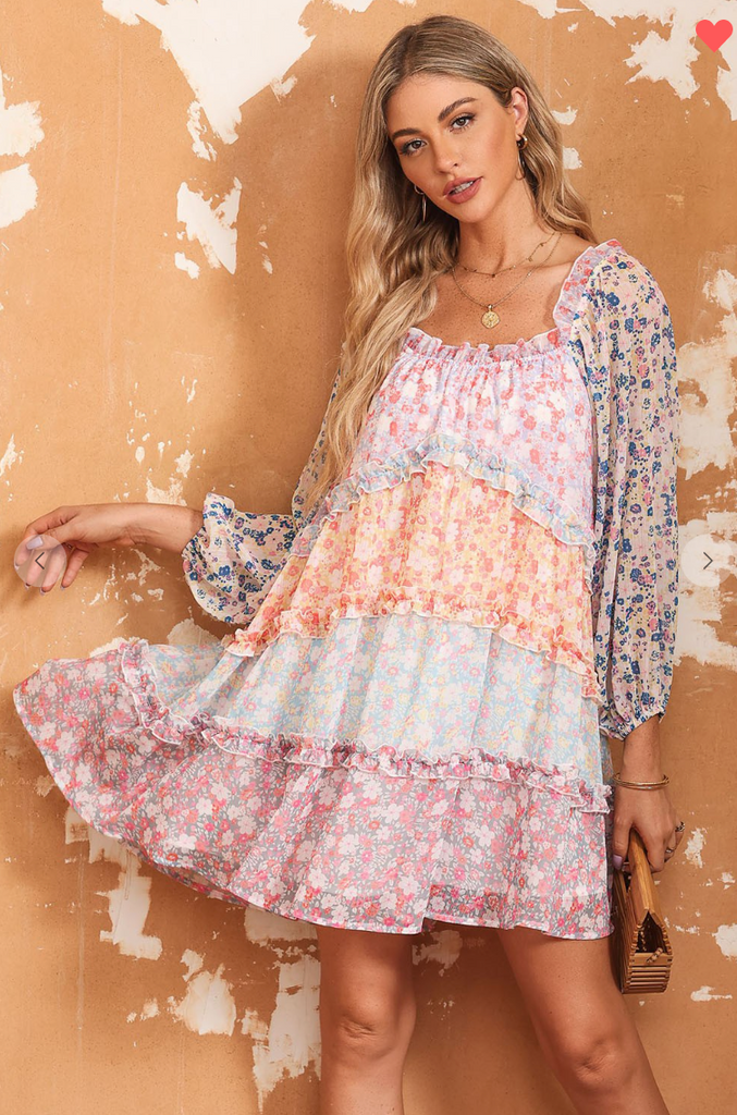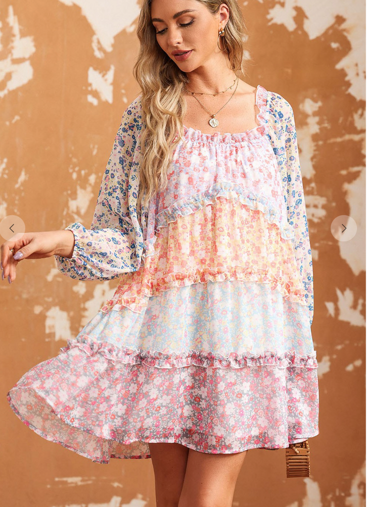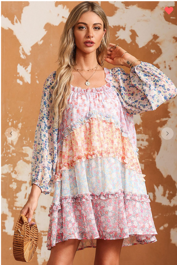 I have been searing high and low for this Chiffon, babydoll dress with a delicate floral pattern It features a tiered frilled color block silhouette. Its light and airy fabric