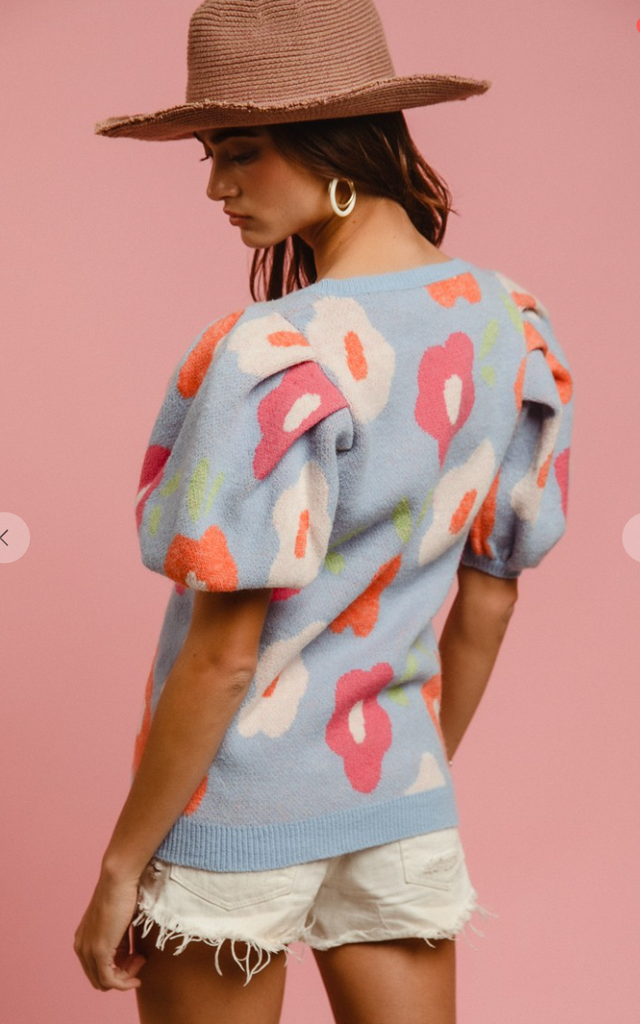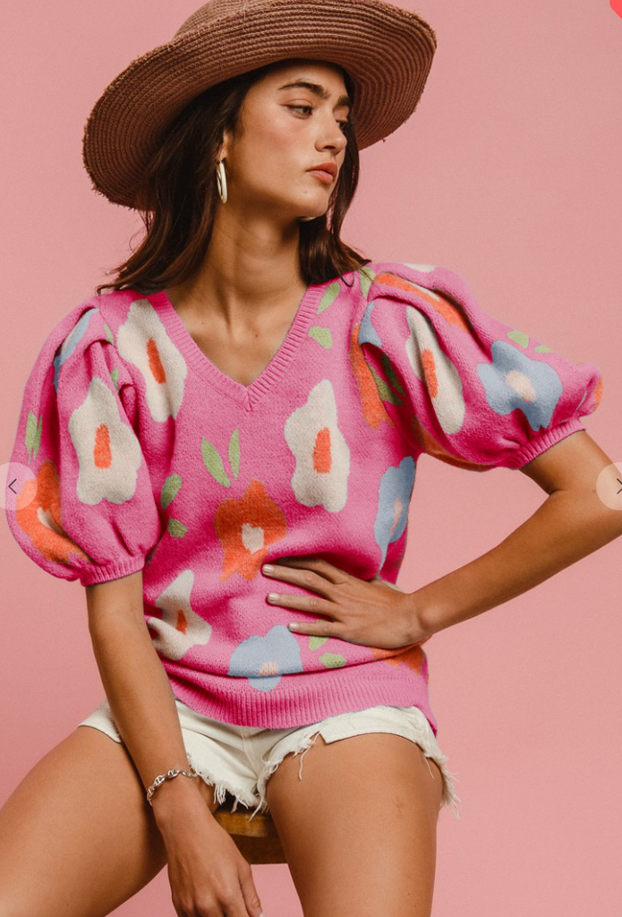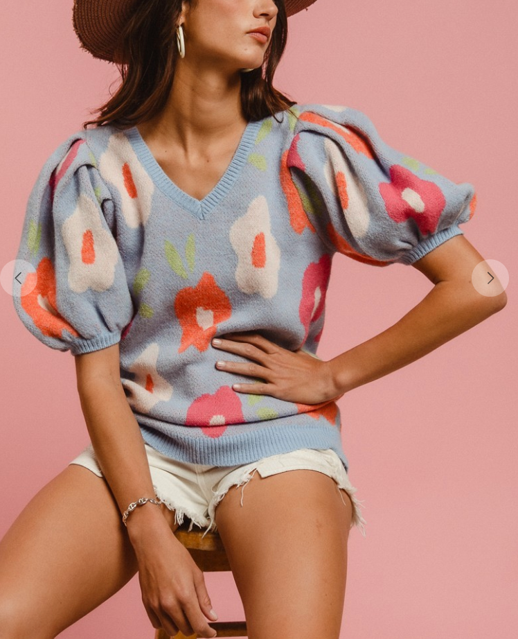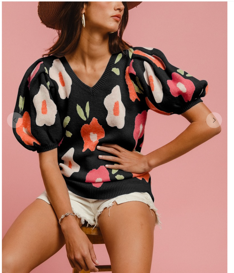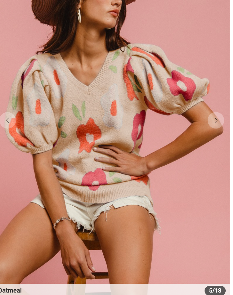 Literally obsessed with this sweater! LOVE the florals set on the amazing backdrops! Cute v Neck sleeve, and easy to pair with shorts and denim or skirts!!!