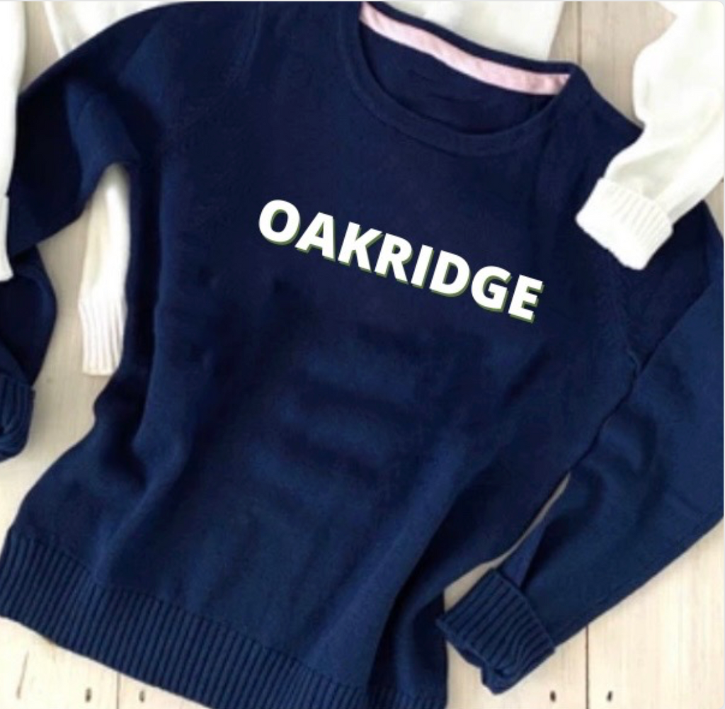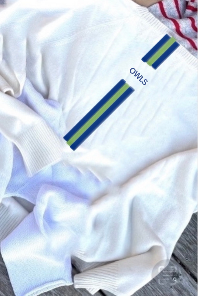 1. White Sweater- OAKRIDGE in Navy trimmed in Green. Green/Blue/Green stripe in the back with OWLS IN NAVY.