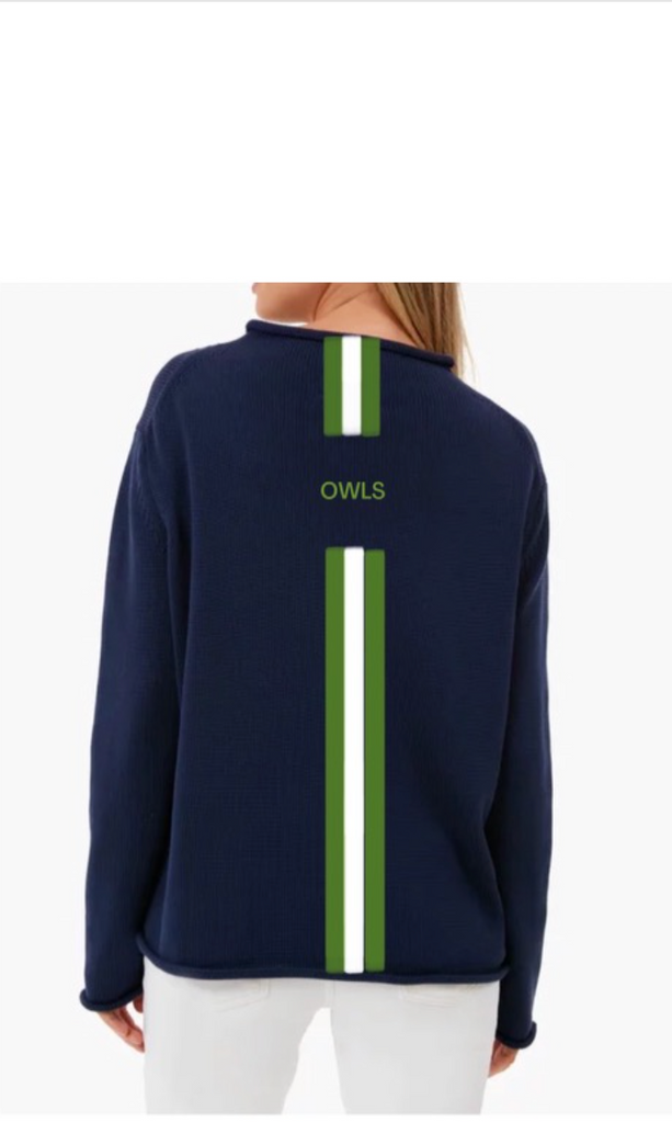 2. Navy Sweater- OAKRIDGE IN WHITE trimmed in GREEN. Green/White/Green stripe in back with OWLS IN GREEN.
