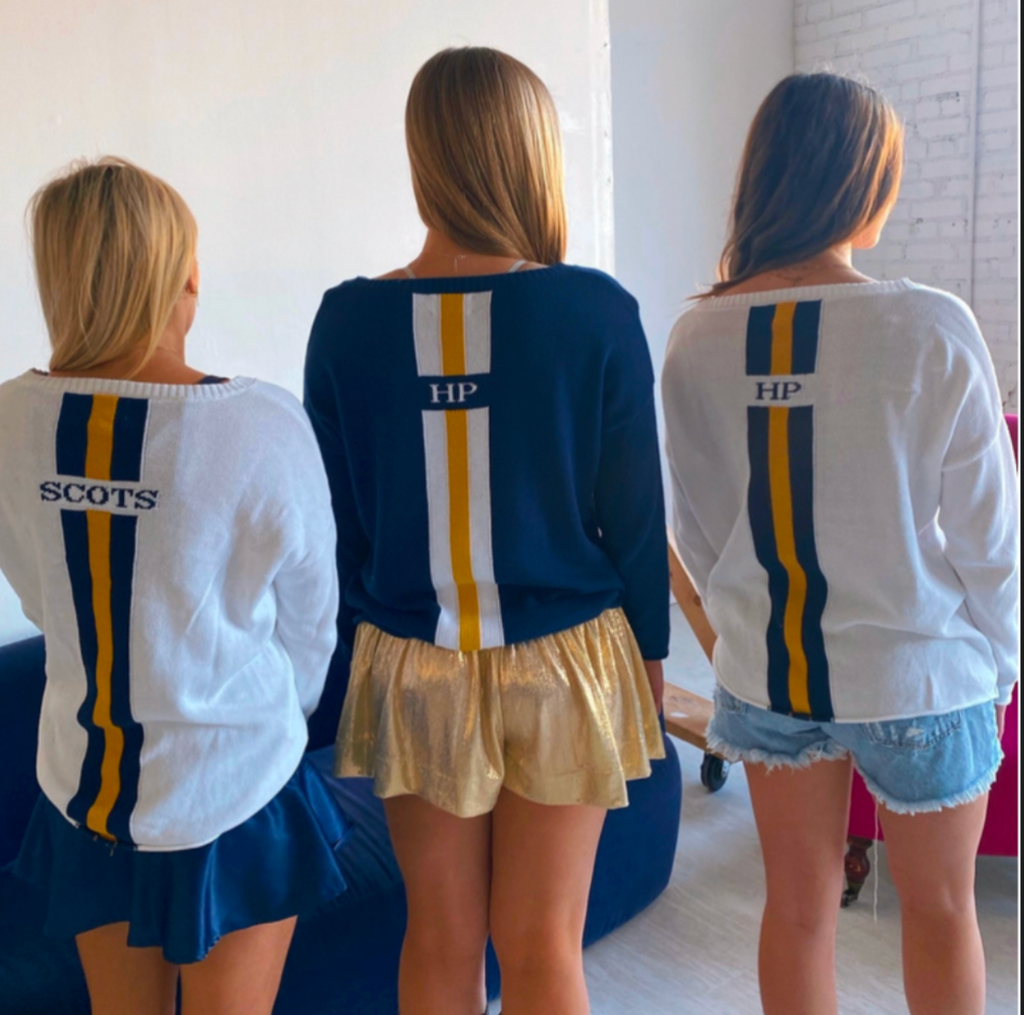 2. NAVY SWEATER: WHITE block letters on front. Silver and White stripes in back with White SJP