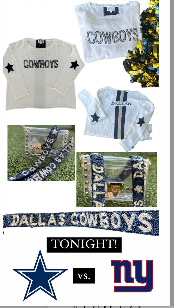 Our Newest Custom COWBOYS sweater is a 100% cotton rolled hem sleeve and cuff with COWBOYS in silver trimmed in navy. Navy stars on the sleeve and our signature navy/grey/navy stripes on the back!
