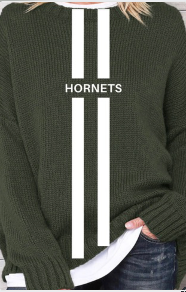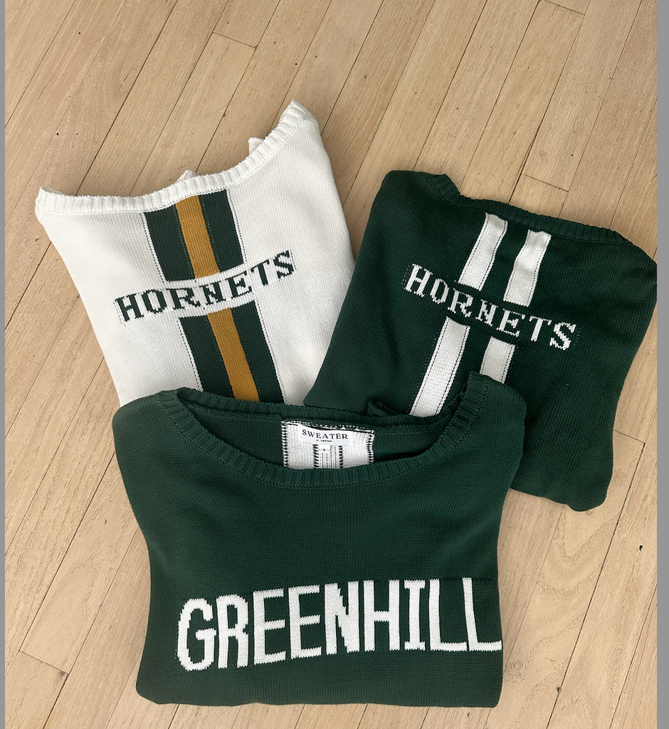 2. Green Sweater- White "GREENHILL" letters on the front. On the back White/Green/White stripes with HORNETS in White.