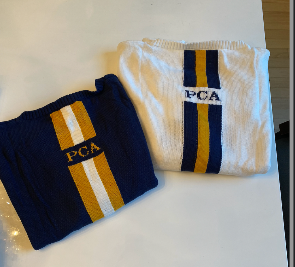 1. White Sweater - "GREENHILL" in GREEN trimmed in Gold on the front. On the back there is are stripes of Green/Gold/Green with HORNETS in Green.