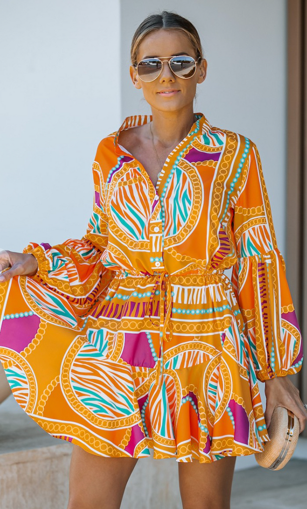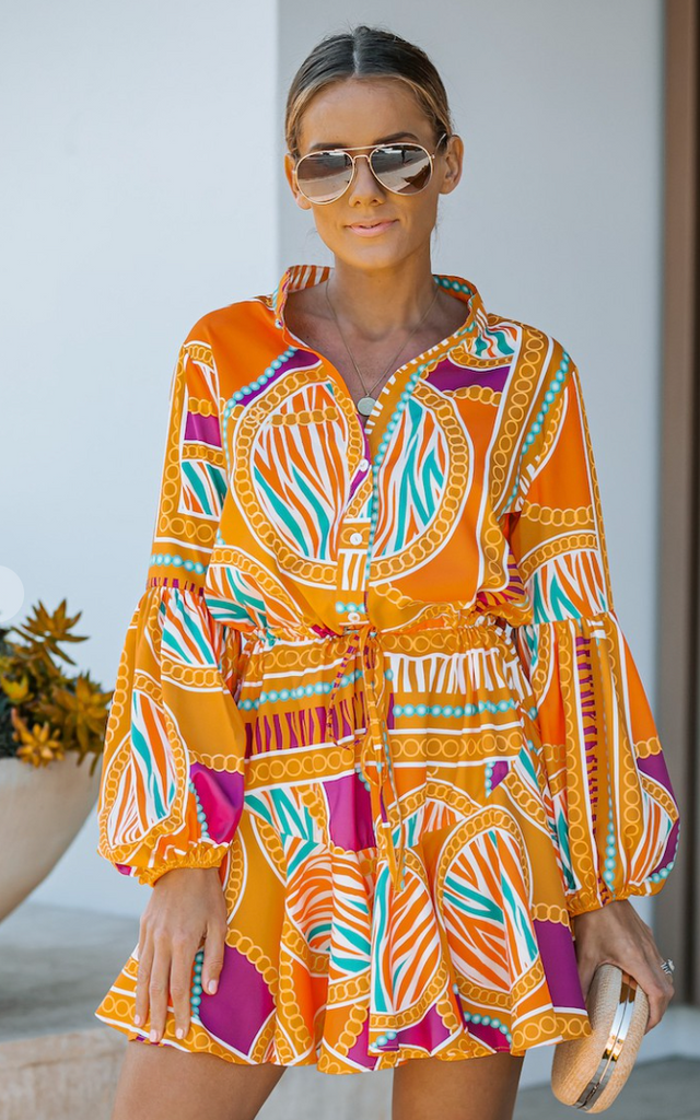 The print is so fun, has a great split neckline with buttons, long lightweight balloon sleeves with elastic cuffs, and a drawstring waistband for an easy fit! LOVEEEEE!!!