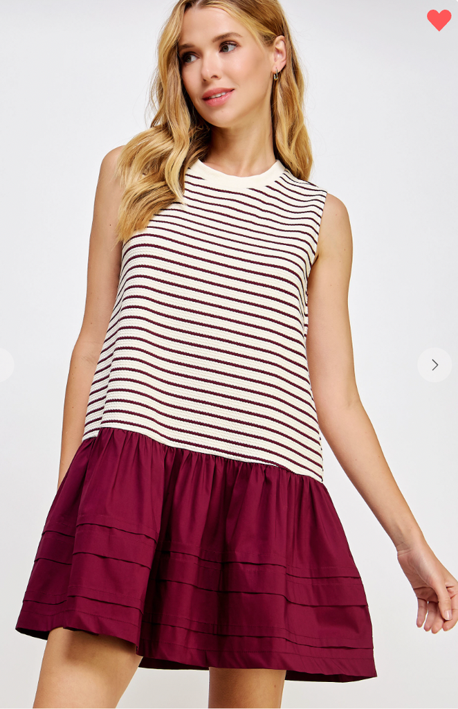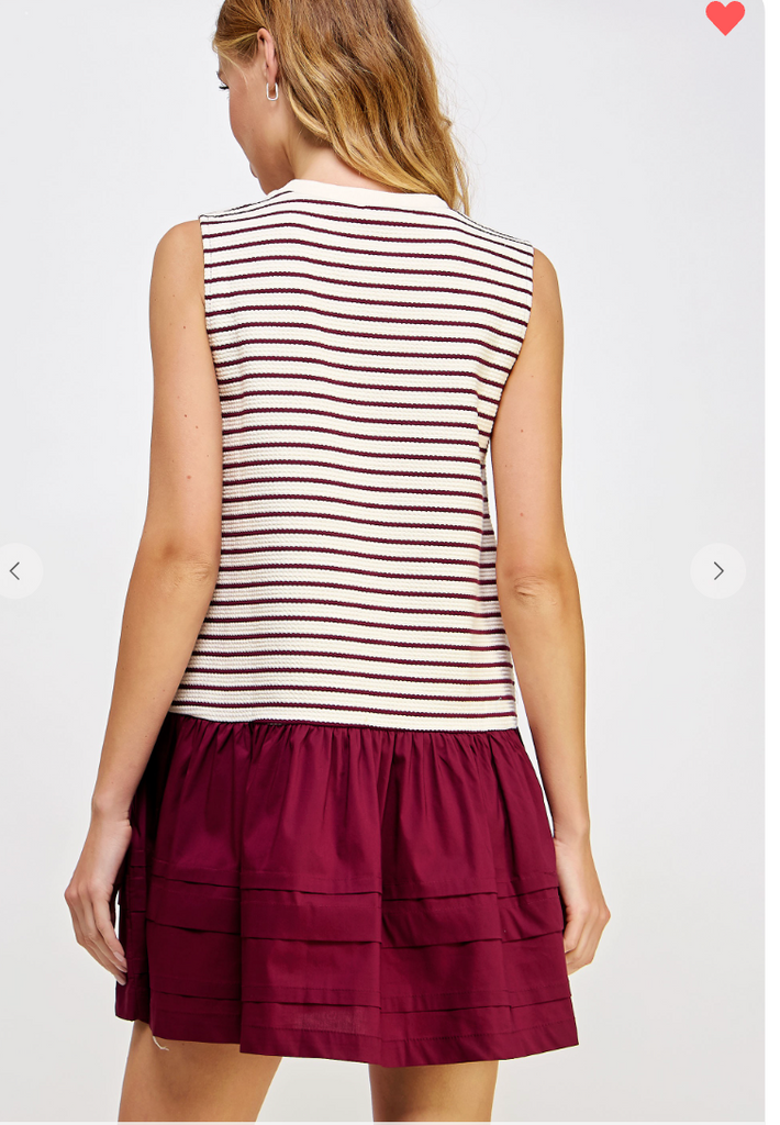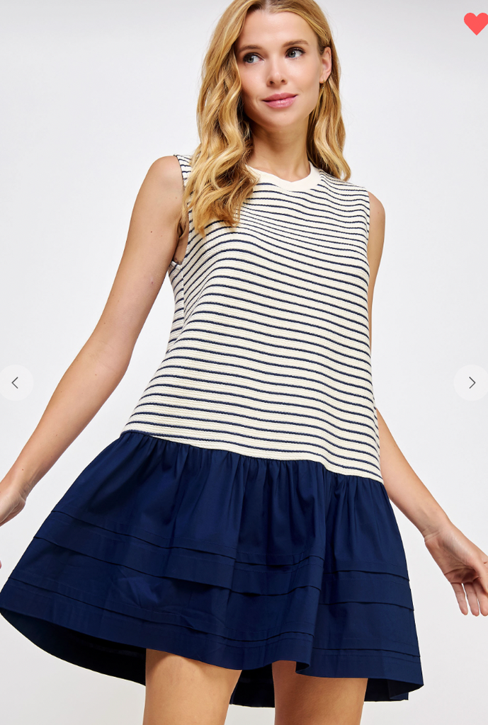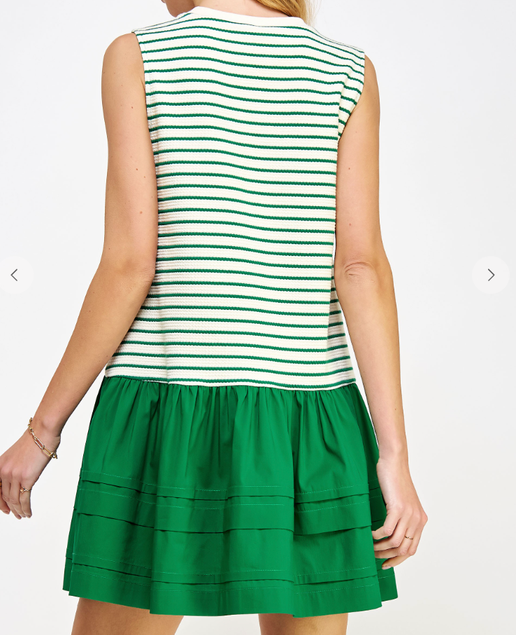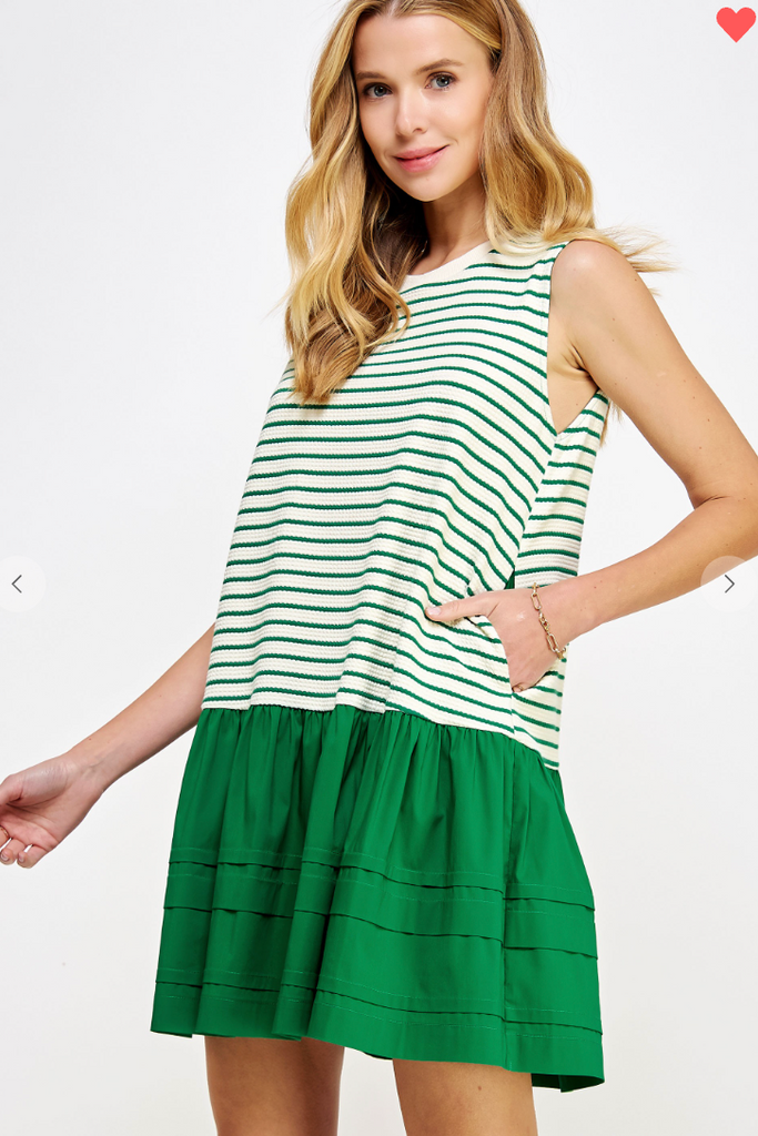 The dress has an A line fit, side pockets, and a skirt with pin-tuck