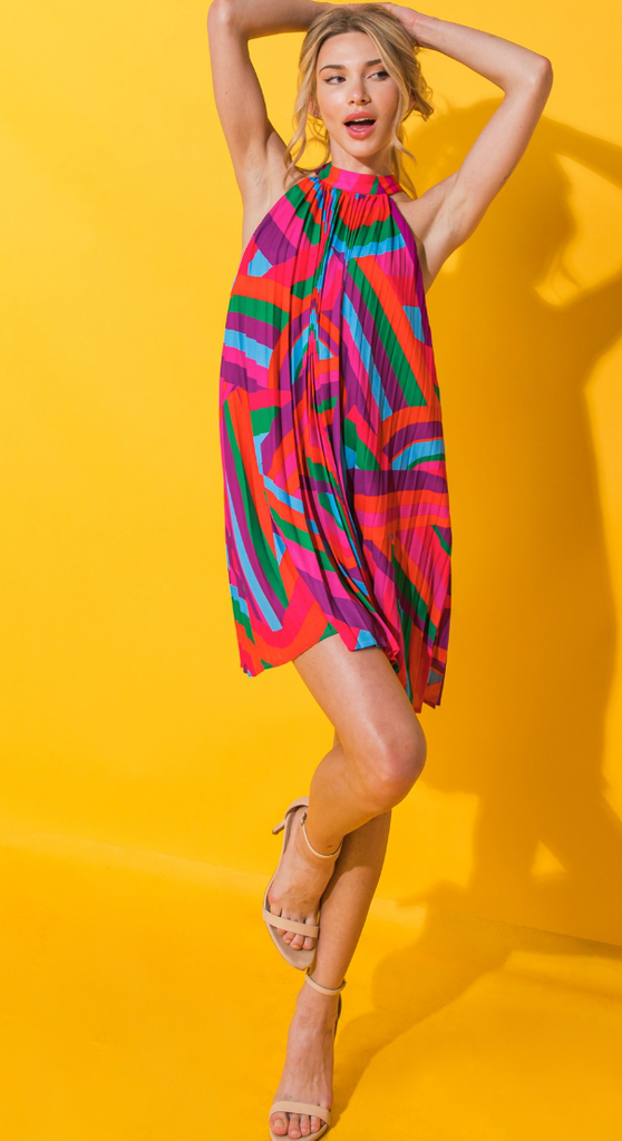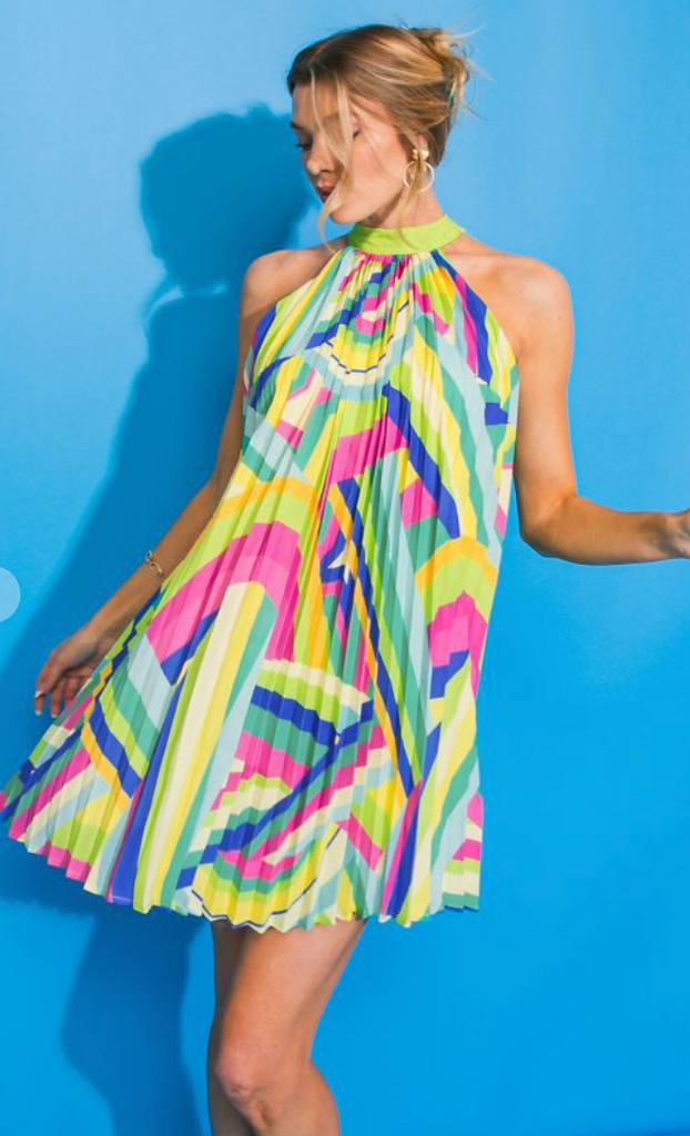 This is a halter with a darling tie back, great A line body and the most fun colors for Summer!