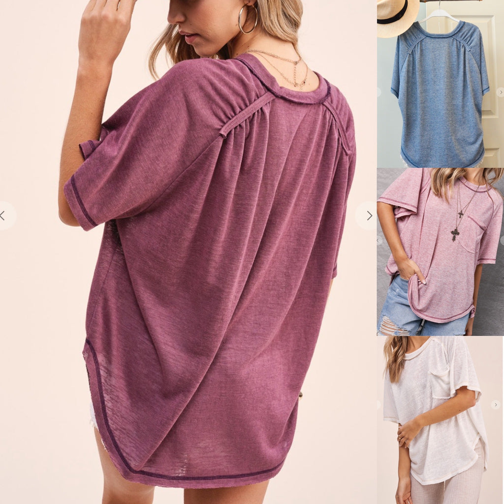 round hemline and gorgeous contrast stitch detailing throughout this top is super cute! Easy to wear and pair with any and all bottoms