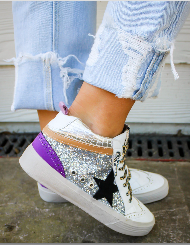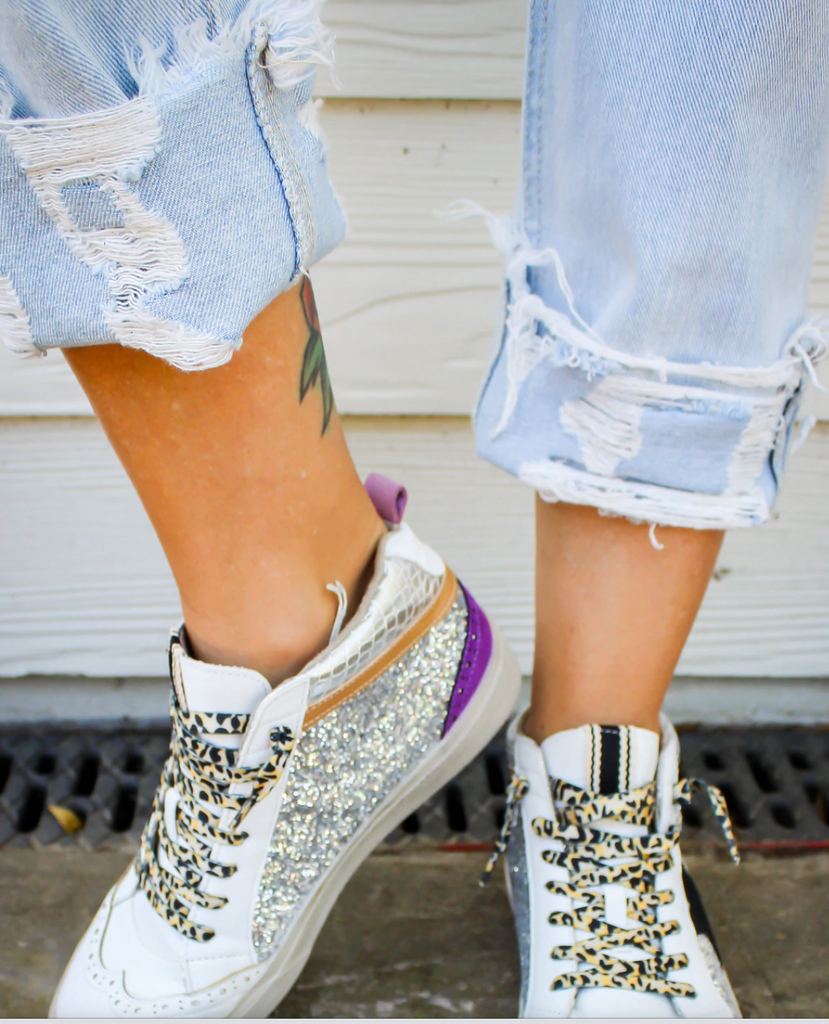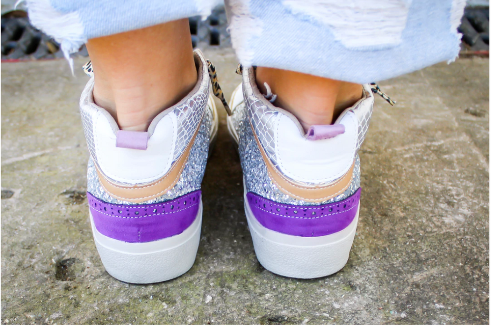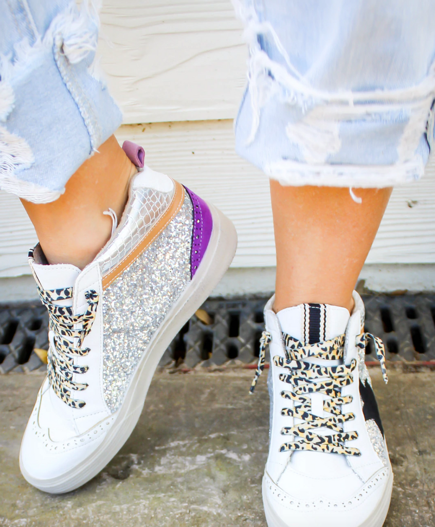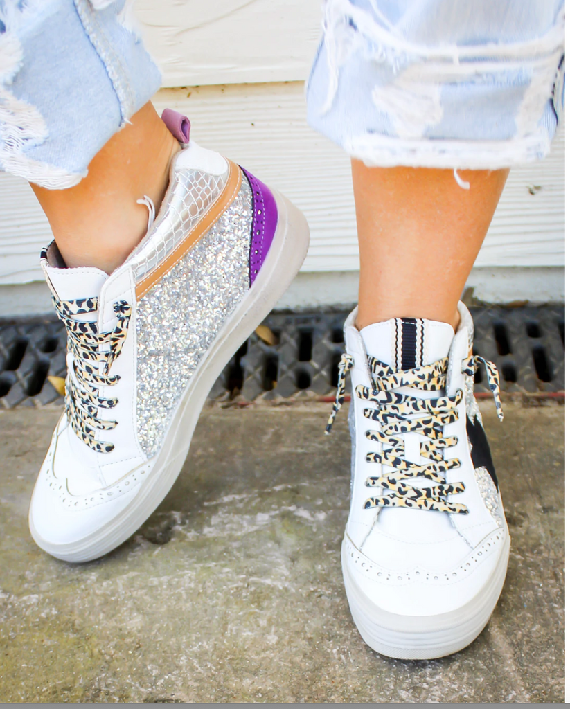 A fun statement high top sneaker for the bold. These RINA sneakers feature leopard print laces(comes with a black pair of laces also), metallic snake print at the top of the ankle, glitter detail and a suede-like pop of purple at the bottom heel of the shoe.