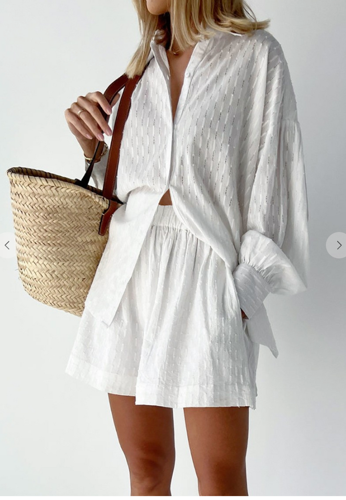 Cute button down shirt and pull on shorts make this the easiest outfit you will own!