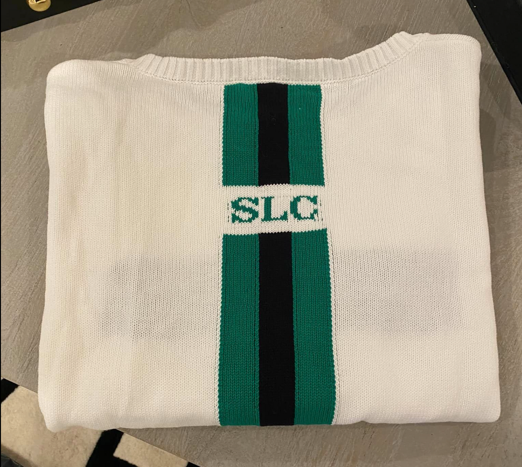 1. WHITE! It is 100% cotton, lightweight, rolled hem and cuffs and has the knitted letters in the front that say "DRAGONS" in GREEN trimmed in BLACK. Then we we are adding the detail stripe of the SCHOOL COLORS in the back with SLC IN GREEN. It will be your favorite Southlake Sweater!
