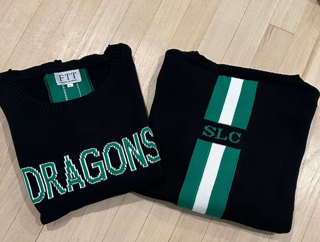 2. BLACK: It is 100% cotton, lightweight, rolled hem and cuffs and has the knitted letters in the front that say "DRAGONS" in GREEN trimmed in White. Then we we are adding the detail stripe of the SCHOOL COLORS in the back Green/ White/ Green with SLC IN GREEN. It will be your favorite Southlake Sweater!
