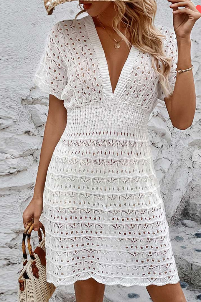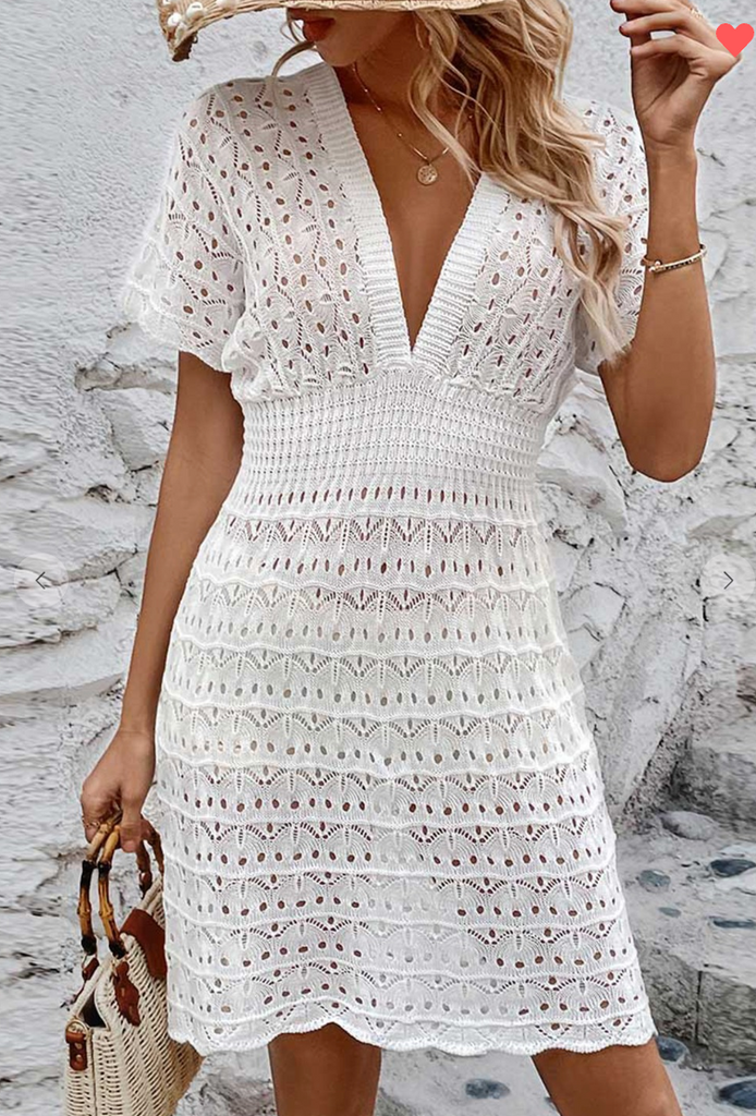 This one is so cute and easy to throw on for the pool or beach! Love the V Neck in the front and back, cute crochet pattern, waist, and great length! Throw this on with any colors!