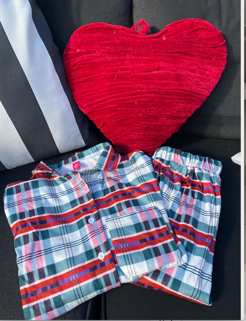 These are the cutest and softest pjs you have ever seen. The red, pink, purple and green plaid is perfect for the Winter months ahead. They are soo soft and so cute. Grab them for a cute Valentines gift. Immediate Ship!